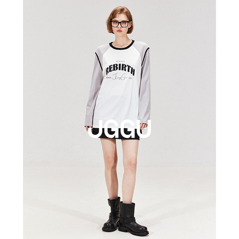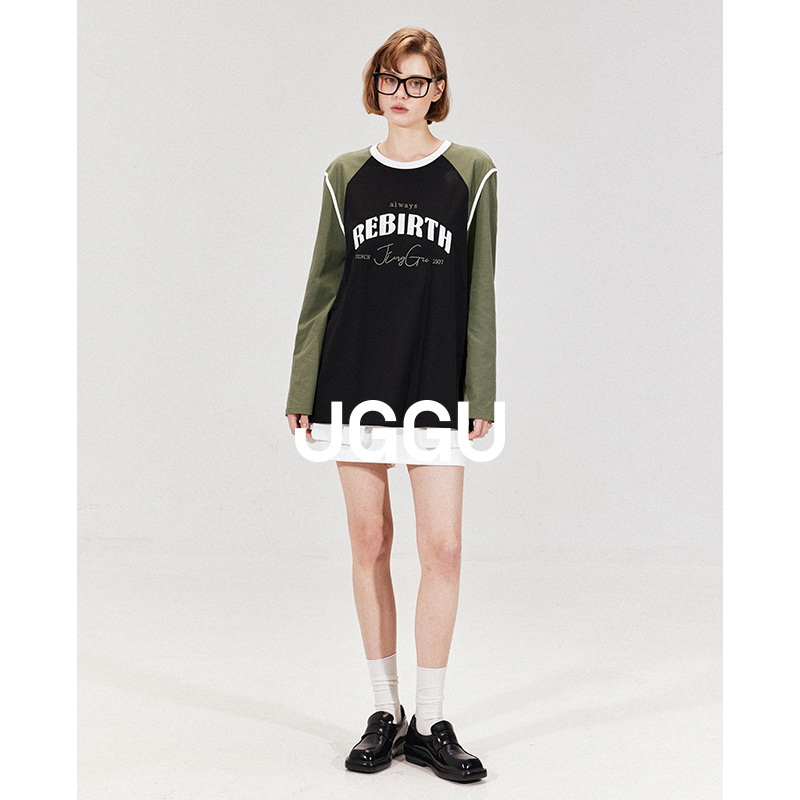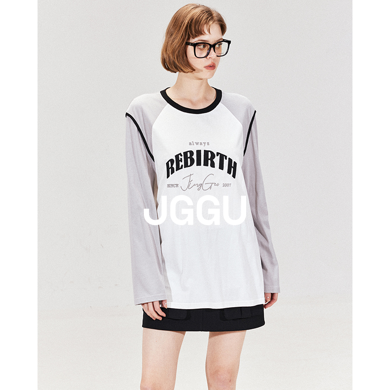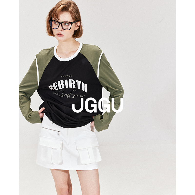 晶咕黑标JGGUcolour碰撞复古感美式 T恤 运动刺绣撞色插肩女长袖