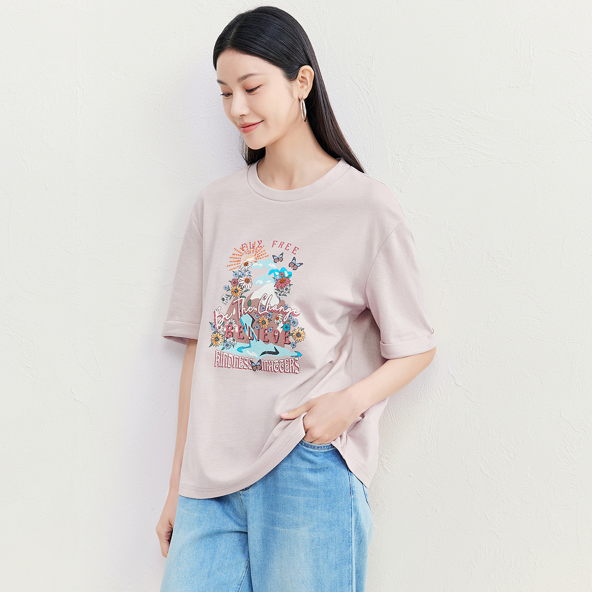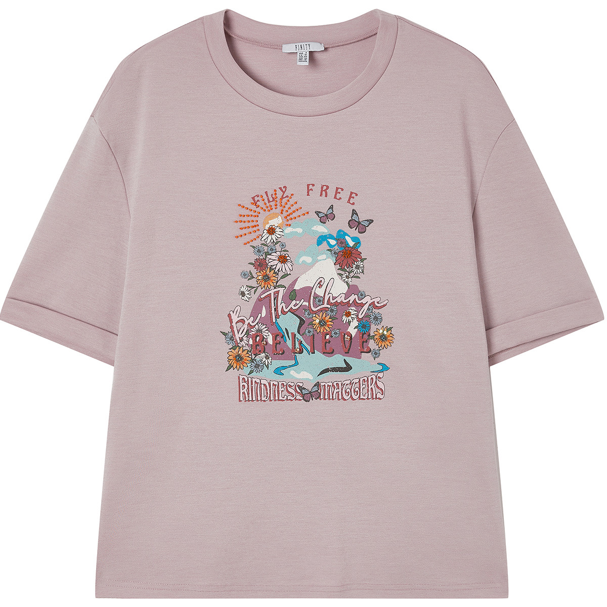 FINITY菲妮迪T恤2025年夏季 简约粉色印花气质通勤休闲上衣女 新款