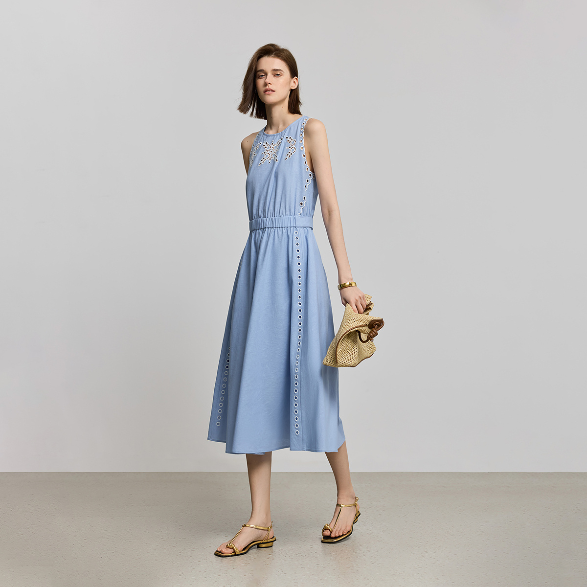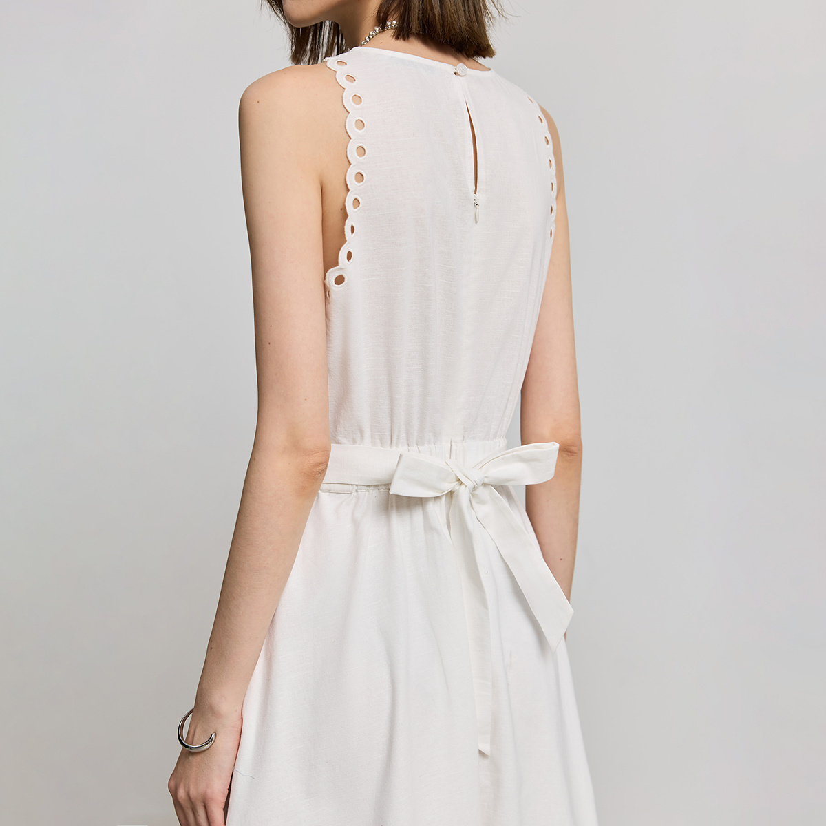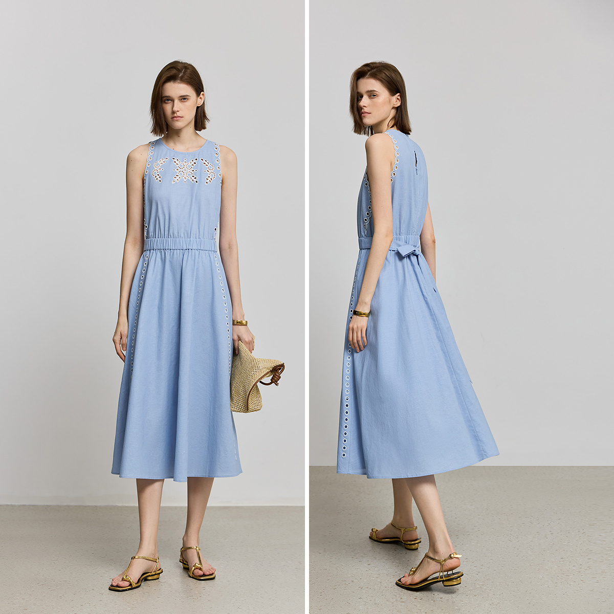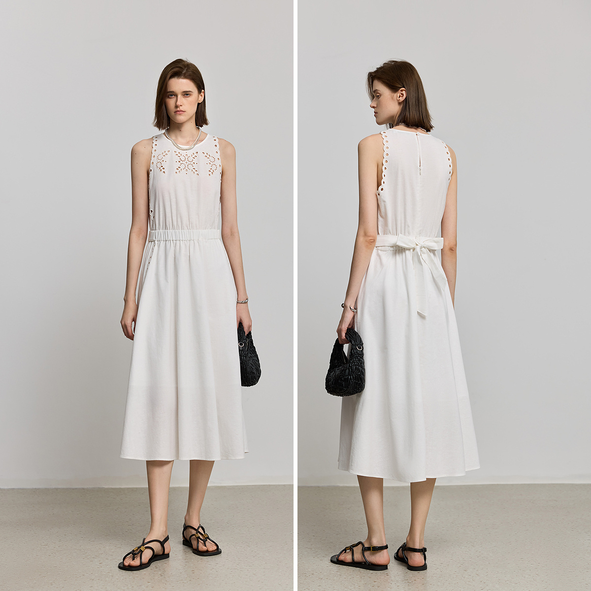 LILY2025新款 收腰休闲连衣裙女 简约气质度假风镂空蕾丝绣花无袖