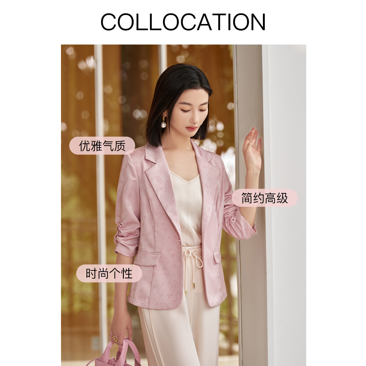 COCOBELLA高智感拼接人丝无领西装 女早秋通勤休闲气质外套SI533B
