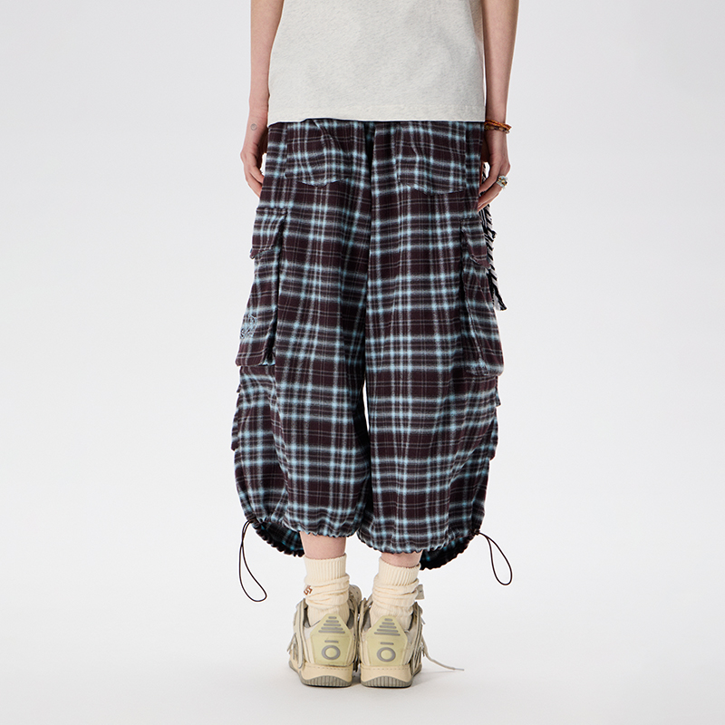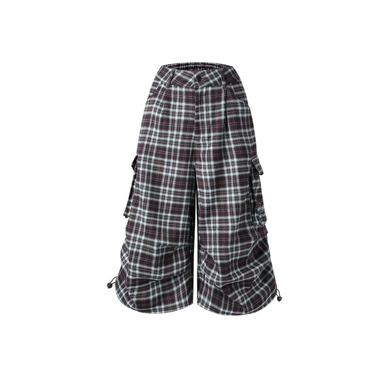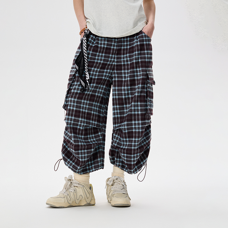 宽松直休闲感阔腿裤 女美式 男 夏季 LAMLICKA蓝色格子褶皱口袋七分裤