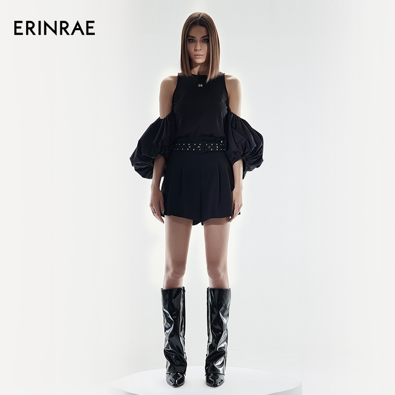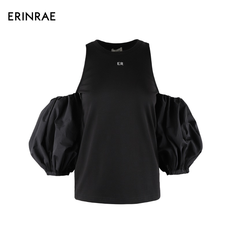 ERINRAE 女上衣EF211162CO20 黑色100%纯棉圆领漏肩气质灯笼袖