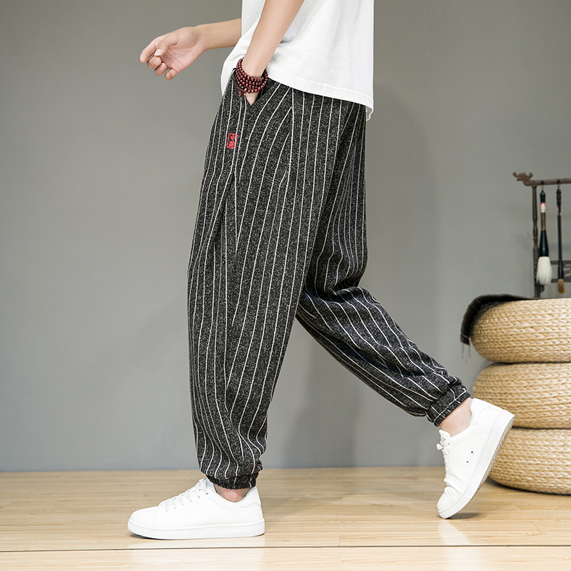 男薄款 日系复古条纹亚麻长裤 夏季 宽松束脚哈伦裤 子 新款 棉麻休闲裤