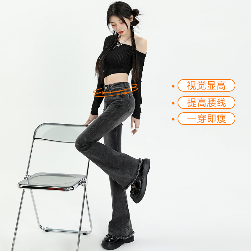 弹力显瘦毛边拖地喇叭裤 灰色微喇牛仔裤 高腰修身 2024年新款 女夏季