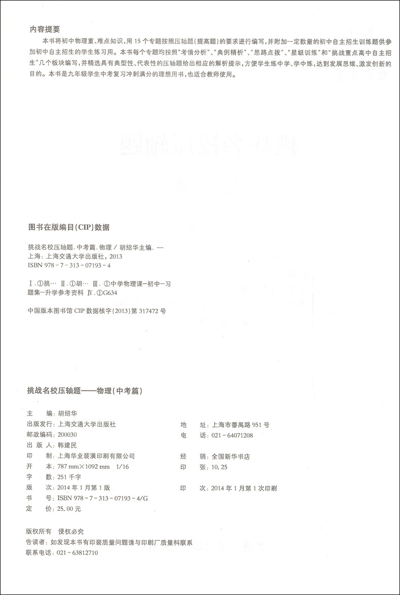 挑战名校压轴题 社9年级 物理 上海交通大学出版 九年级初三物理辅导书中考刷题物理知识大全中考模拟题练习册 中考篇 交大之星
