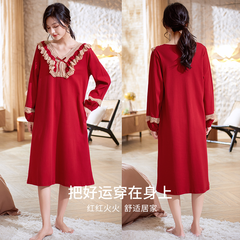 睡衣家居服秋天新娘裙子 2025新款 红色本命年睡裙女春秋季 纯棉长袖