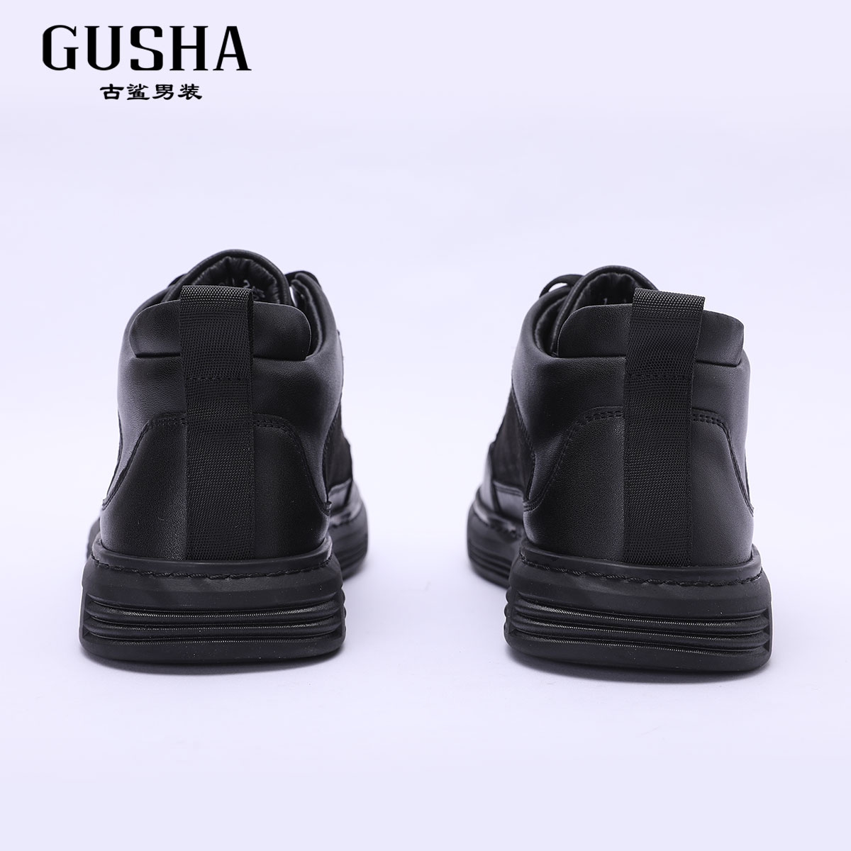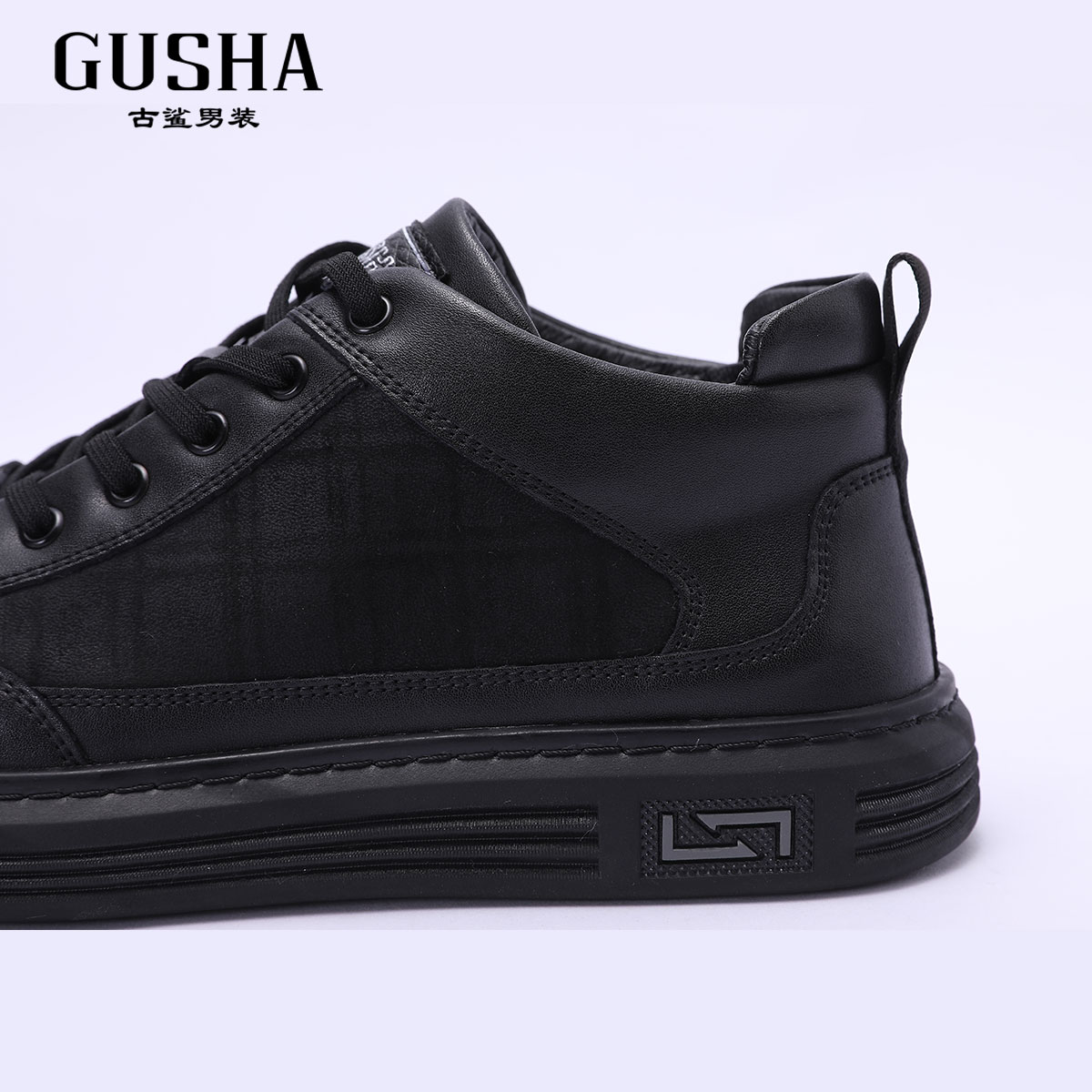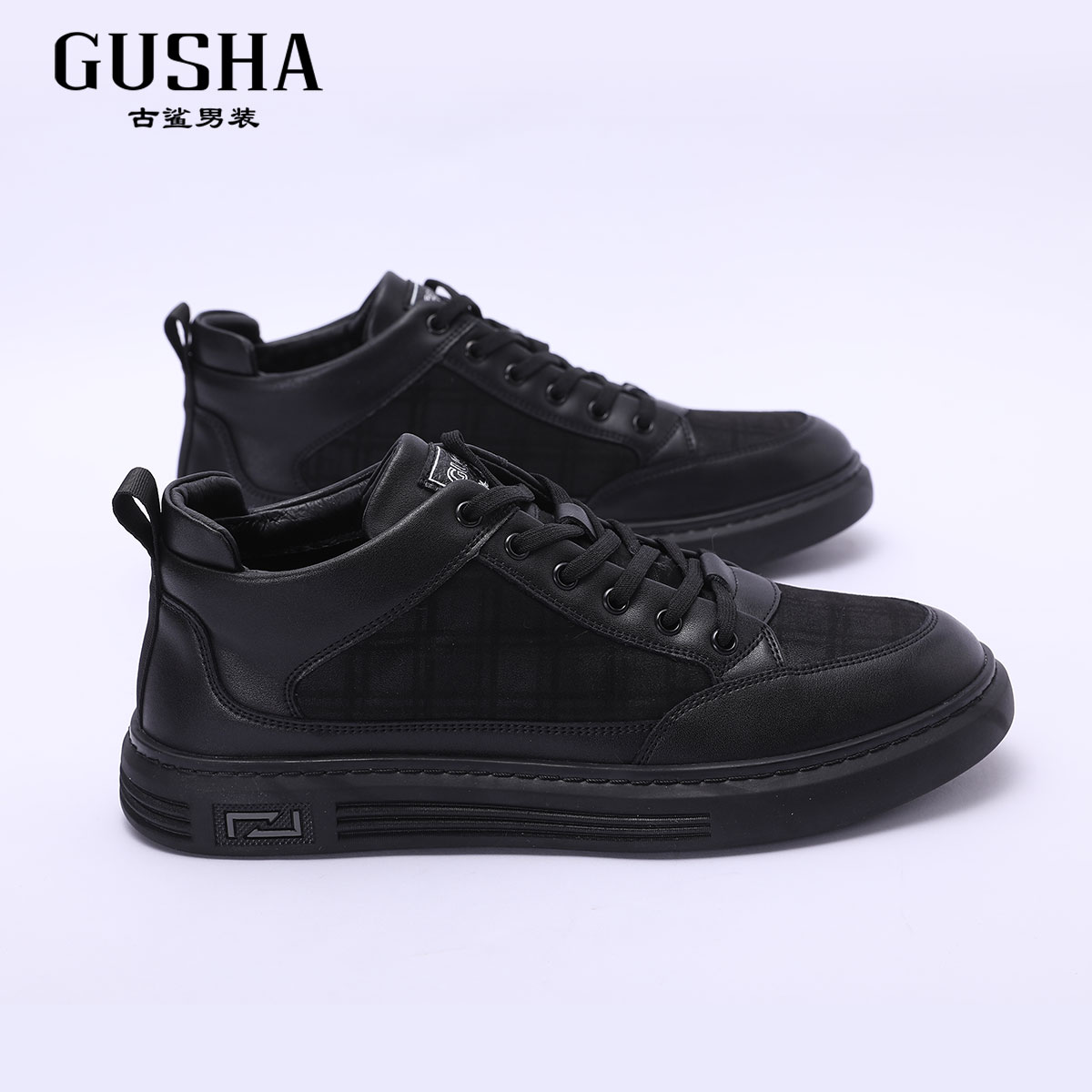 清仓 时尚 古鲨冬季 黑色格纹系带休闲板鞋 舒适帅气休闲鞋 新款