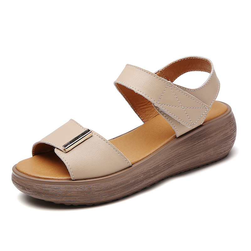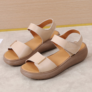 女2025新款 休闲百搭妈妈鞋 夏季 真皮坡跟韩版 厚底舒适防滑凉鞋 凉鞋