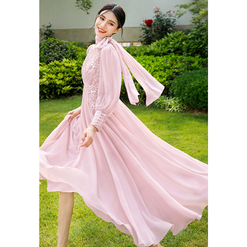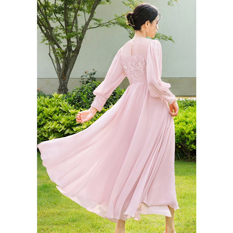 新款 美妃长袖 2023春夏季 宫廷风气质连衣裙长款 女 收腰粉色茶歇法式