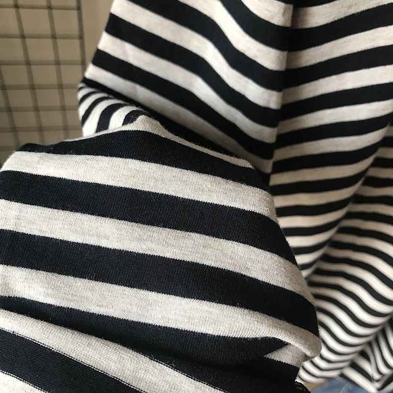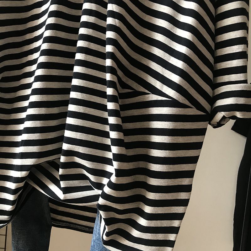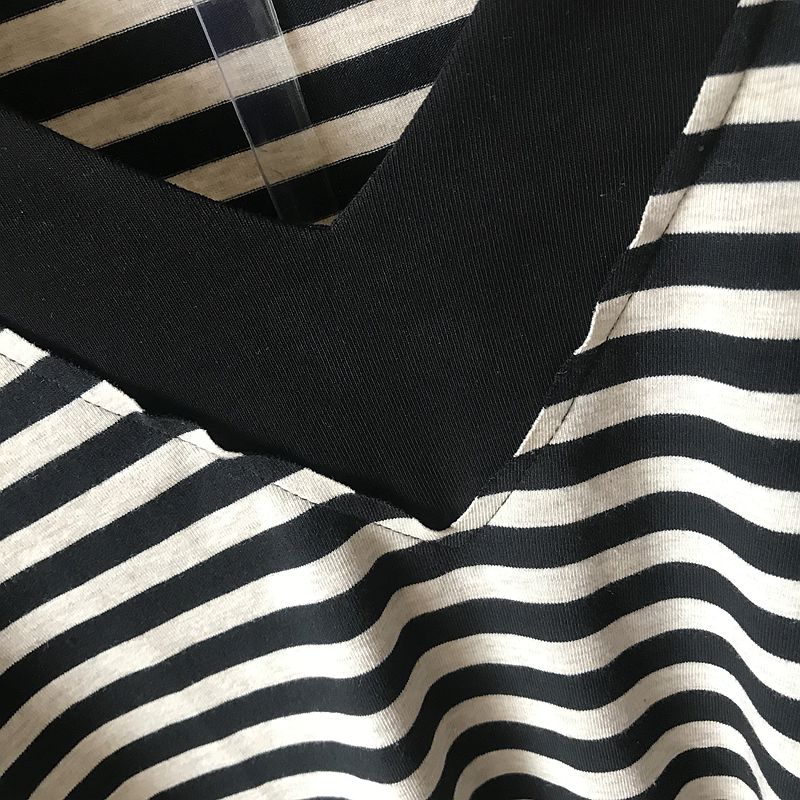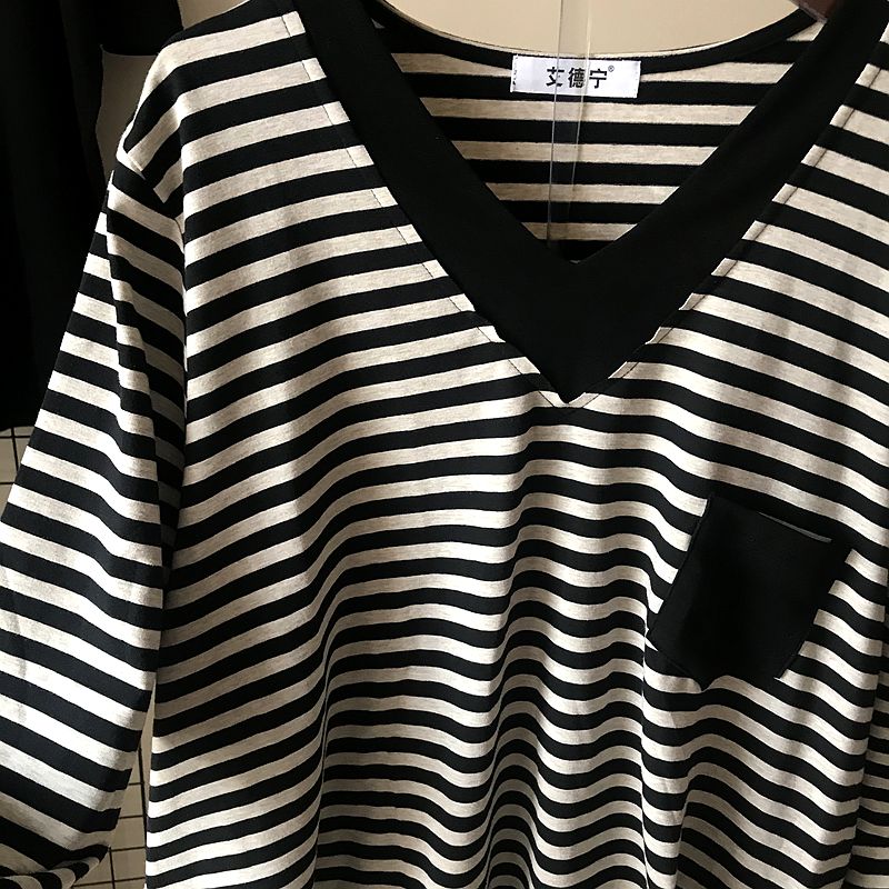 文艺V领拼接口袋条纹显瘦胖mm气质长袖 宽松大码 T恤女 韩版 2024春季