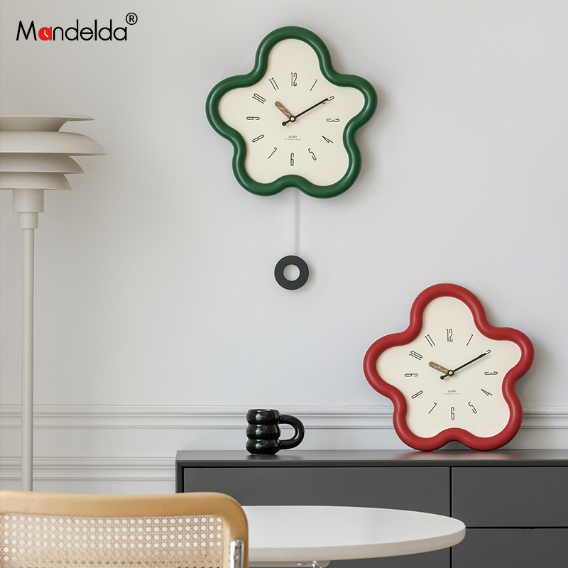 Mandelda奶油风花朵创意摇摆挂钟现代简约客厅大气钟表装 饰墙时钟