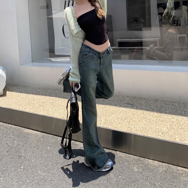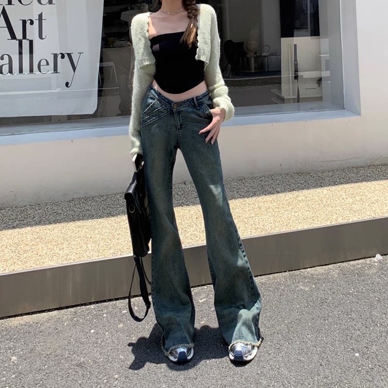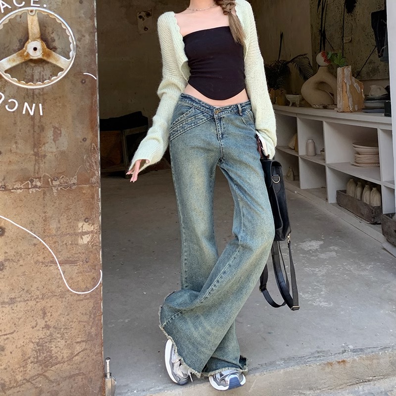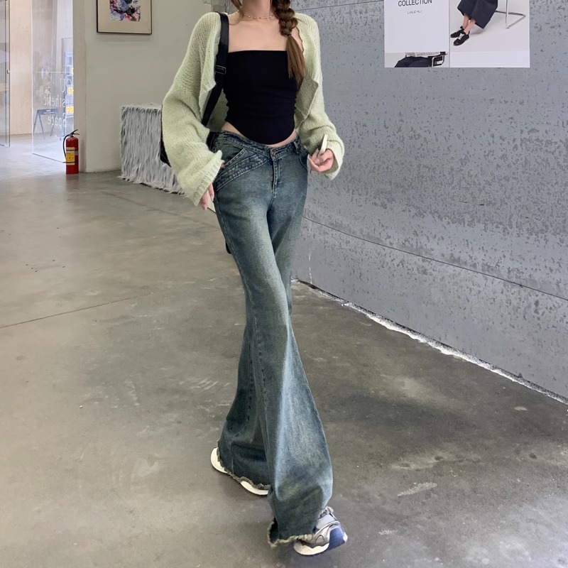 小个子拖地直筒弹力怀旧喇叭裤 高腰马蹄浅色长裤 牛仔女美式 微喇裤
