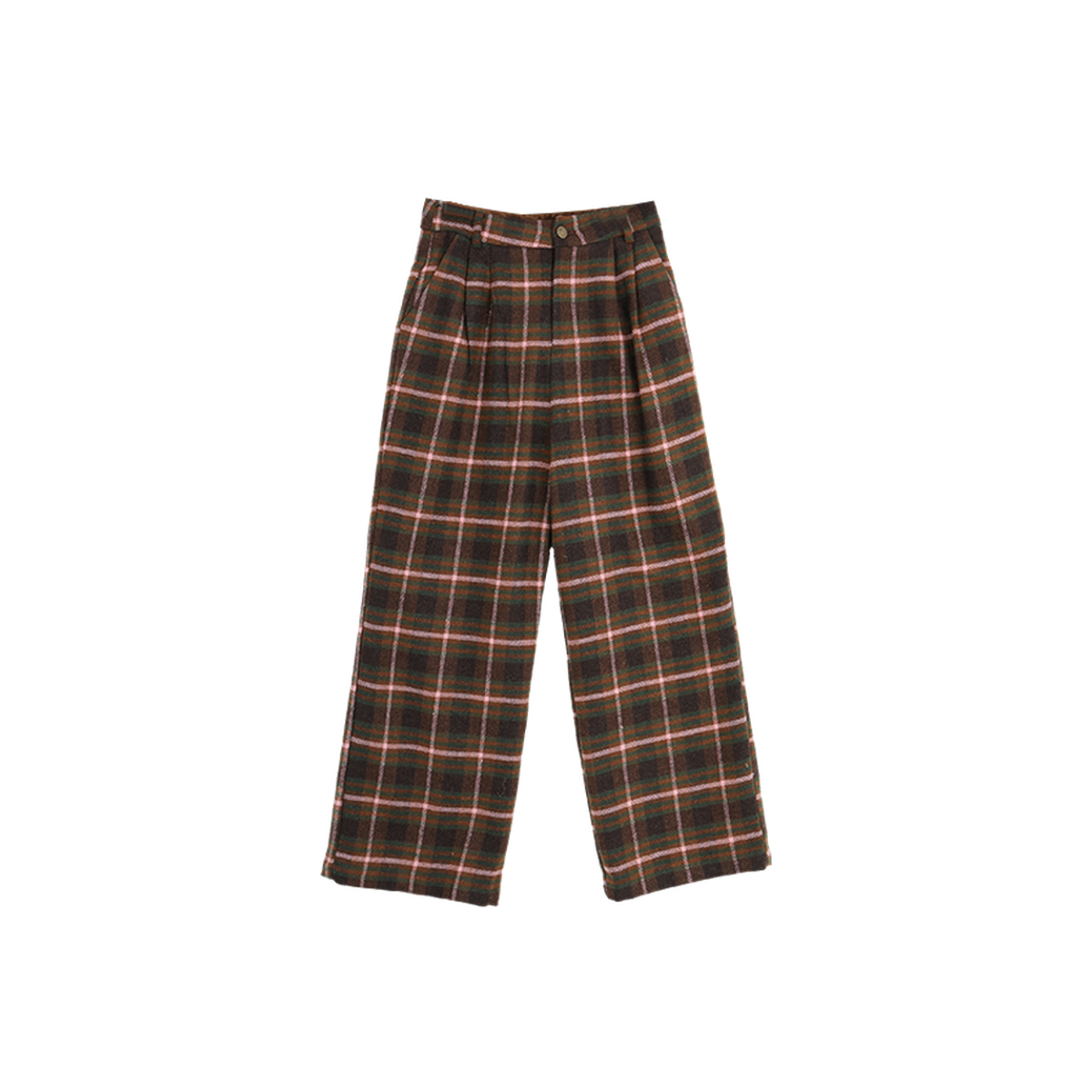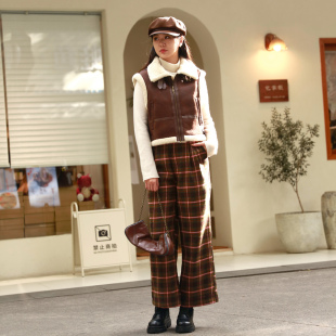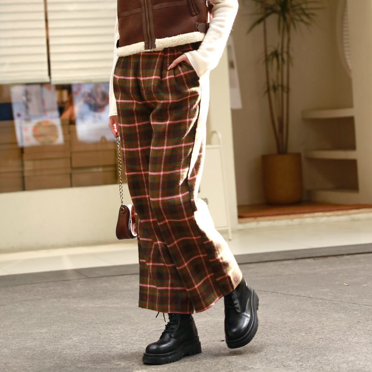 AD8302003 简约休闲感粉咖色毛呢格子长裤 西町村屋直筒裤 女冬新款