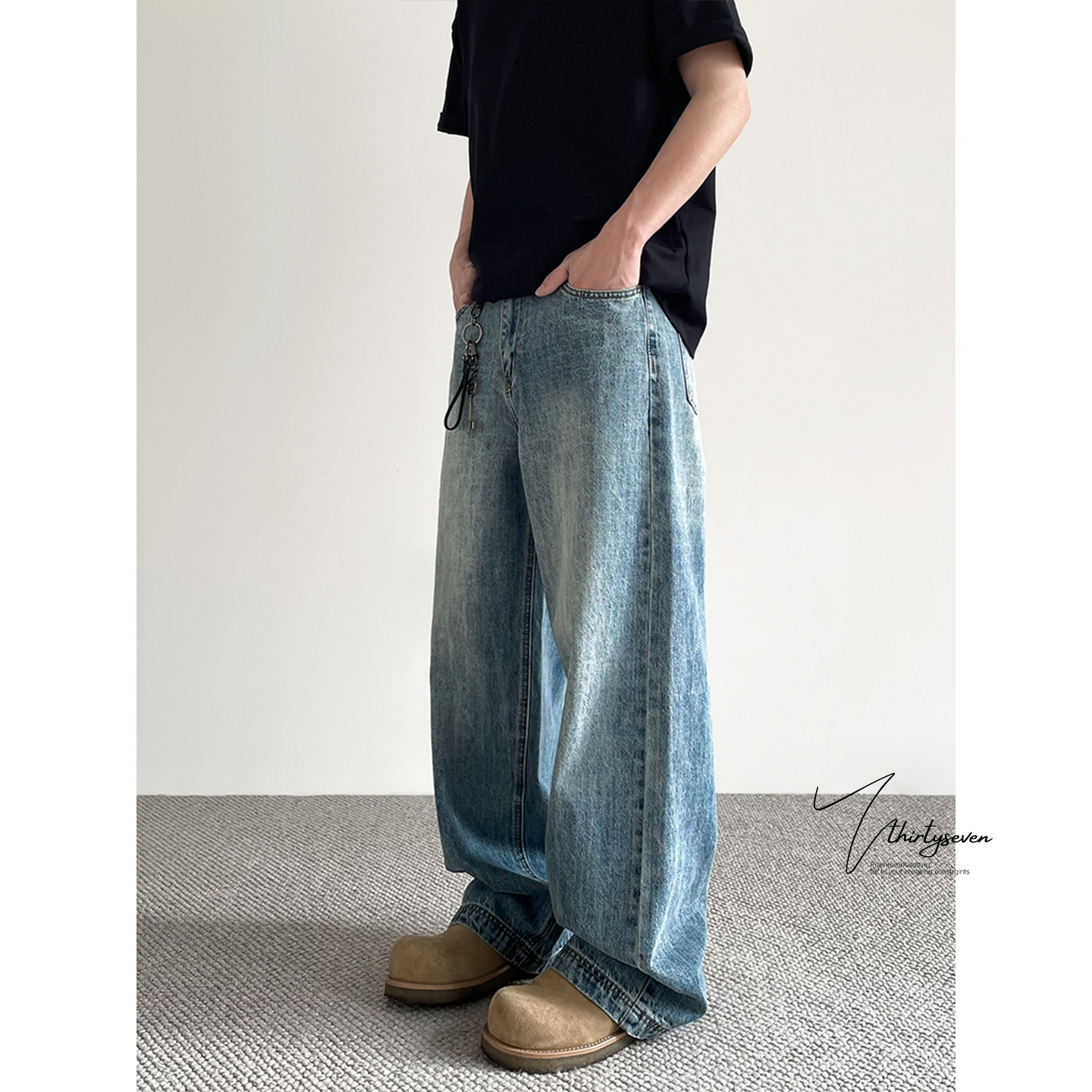 长裤 男宽松直筒阔腿破洞工装 复古水洗做旧竹节棉牛仔裤 JHYQ美式