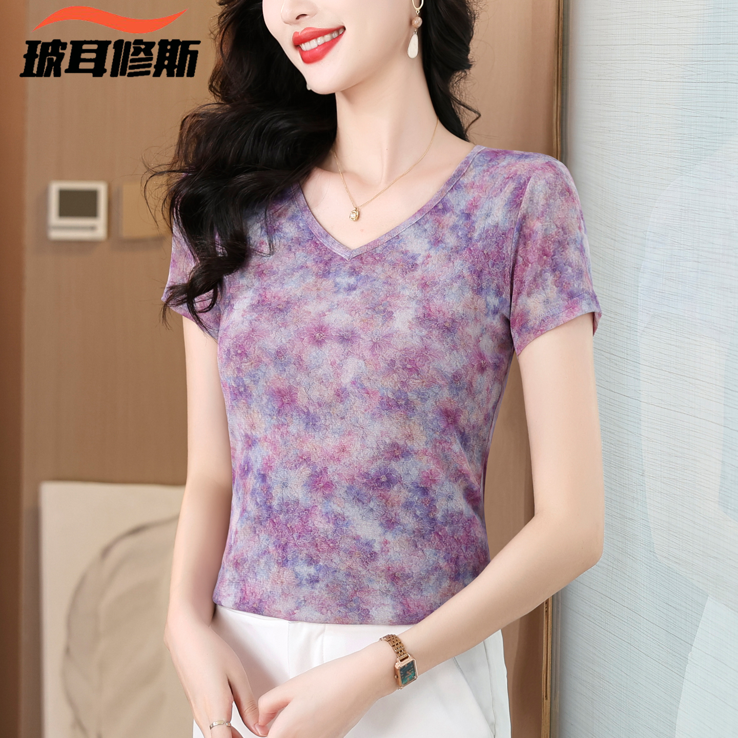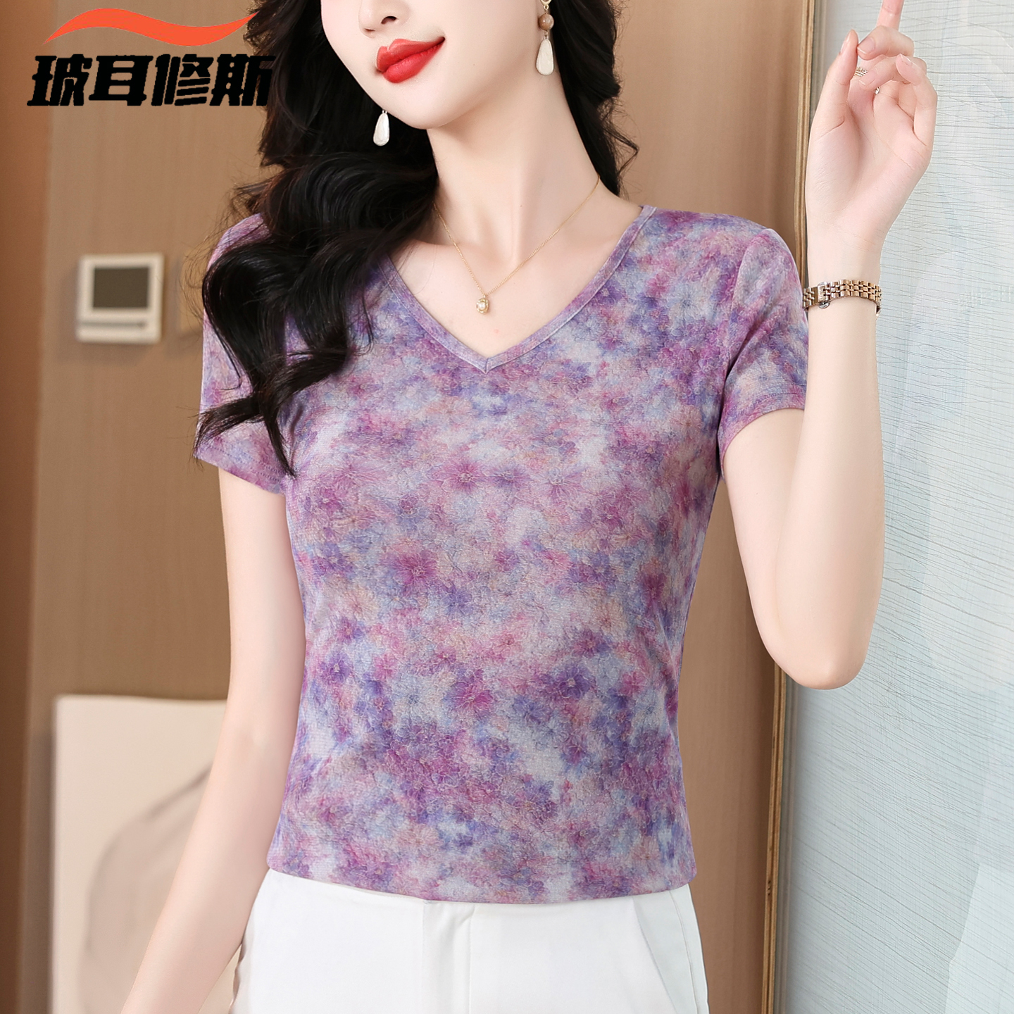 V领网纱短袖 修身 t恤女设计感小众气质显瘦鸡心领蕾丝上衣 新款 夏装