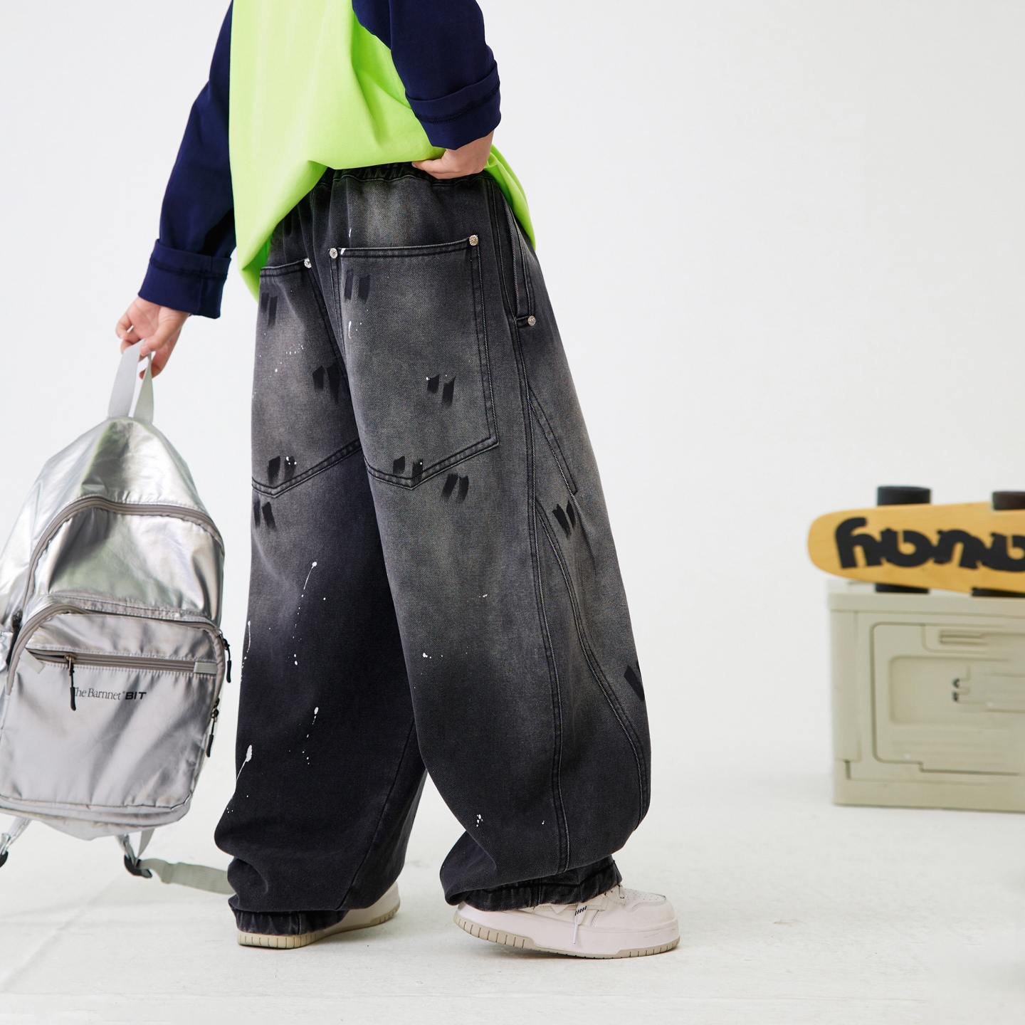子潮 儿童男孩直筒宽松裤 男童春秋泼墨阔腿黑色弯刀牛仔裤 2025新款