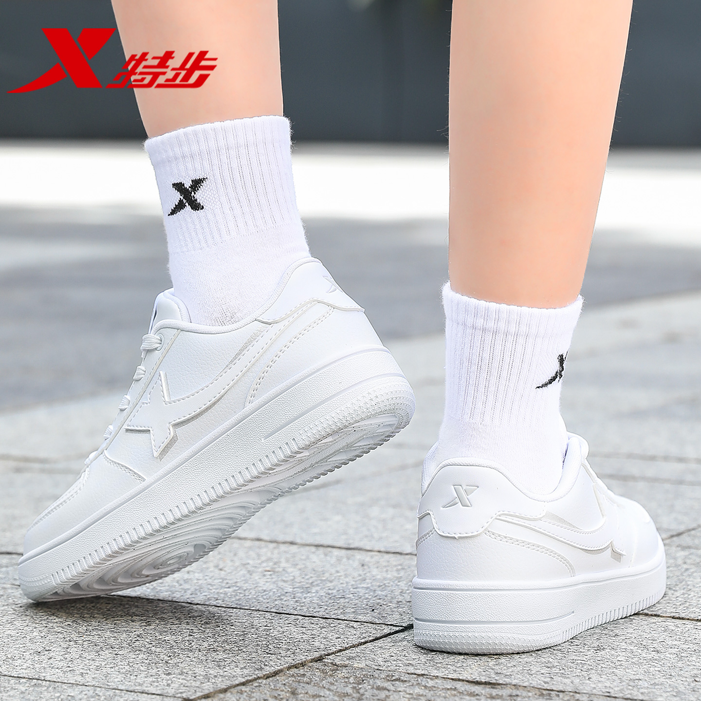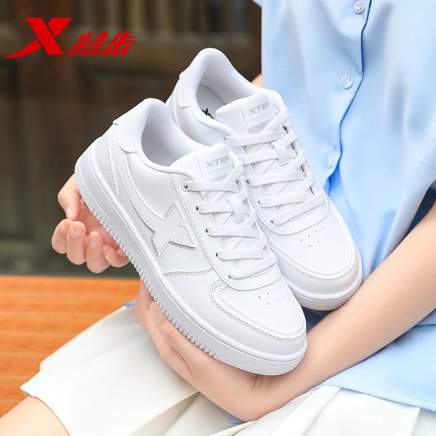 女2025秋季 休闲鞋 新款 学生百搭轻便运动鞋 皮面防水板鞋 特步小白鞋
