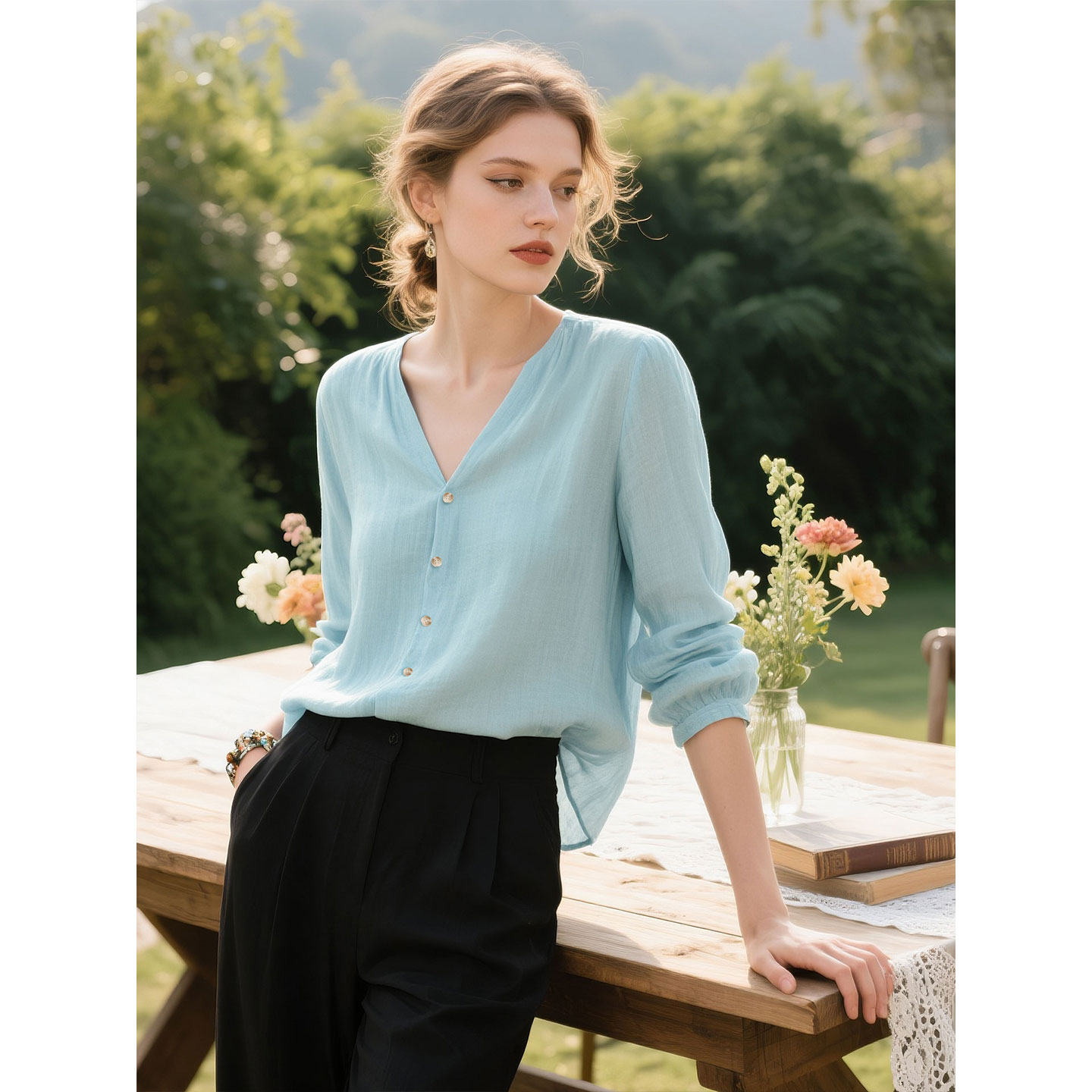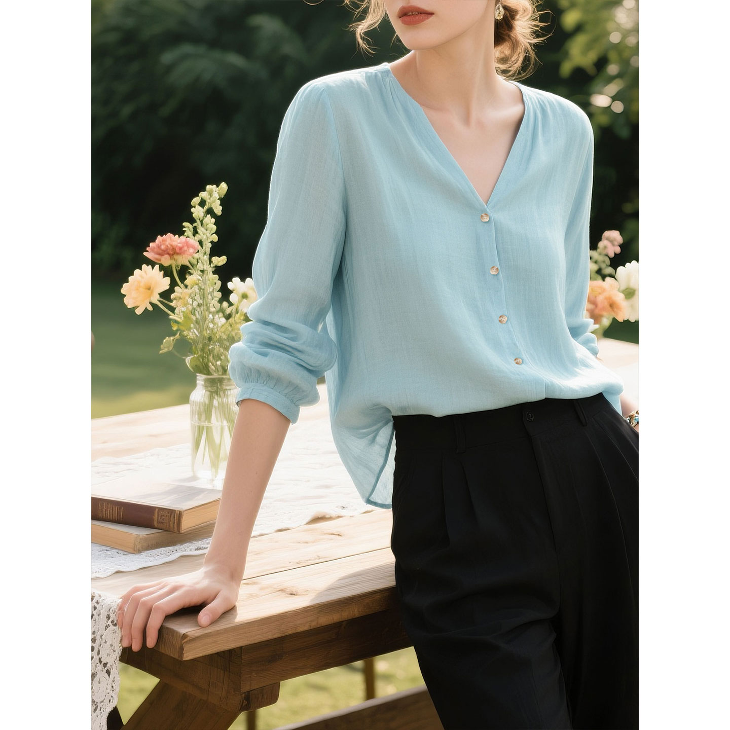 法式 蓝色V领亚麻天丝长袖 新款 女2025年秋季 气质衬衣别致上衣 衬衫