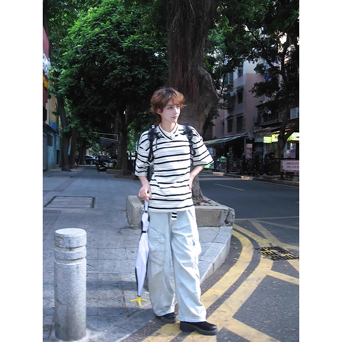 学院风不规则领口半截袖 男夏季 情侣上衣 短袖 米白色撞色条纹polo衫