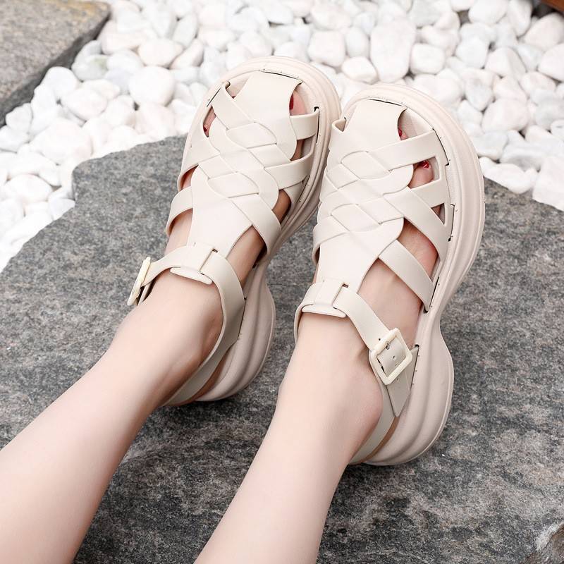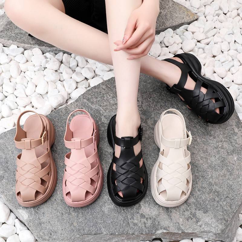 百搭海边沙滩鞋 平底防滑防水时尚 女高跟夏松糕厚底洞洞鞋 包头凉鞋