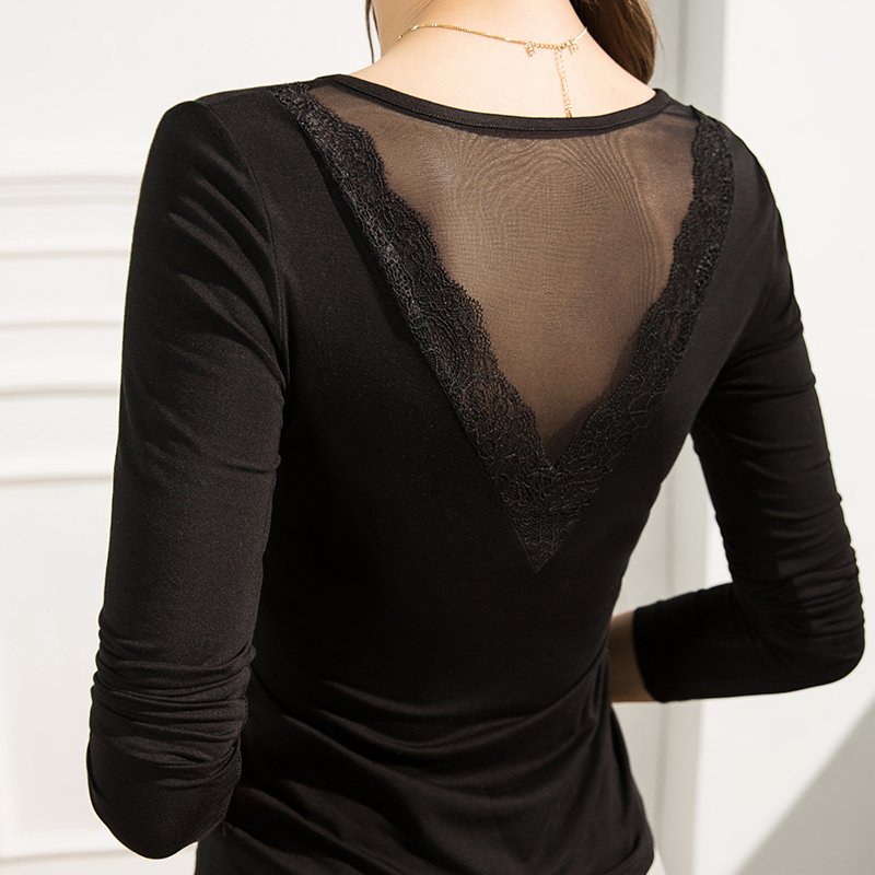 长袖 2025秋季 女修身 黑色V领网纱镂空打底衫 洋气欧洲站春秋T恤 新款