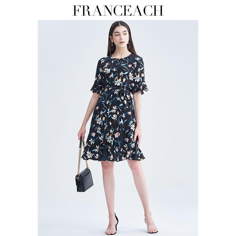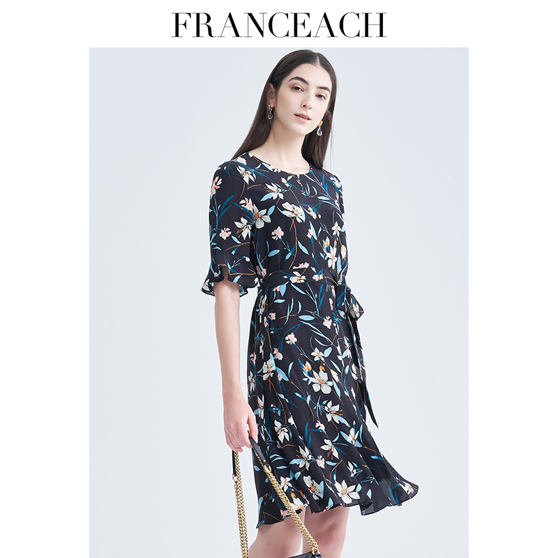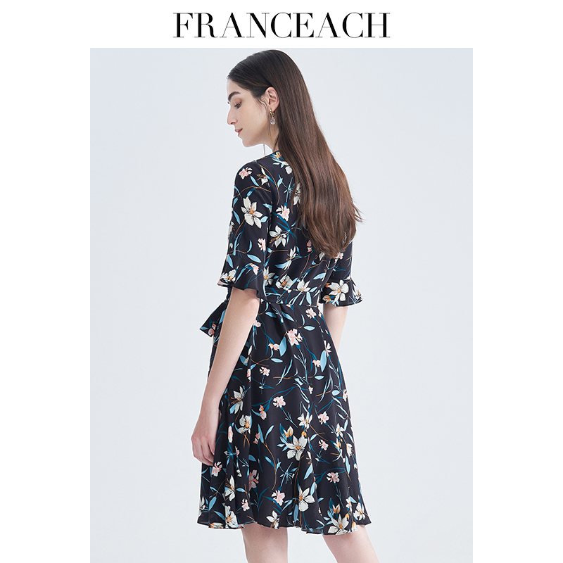 新款 朗姿 LIME莱茵千金风翻领撞色蝴蝶结飘带连衣裙鱼尾收腰修身
