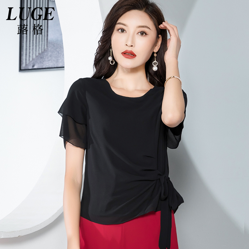 小衫 配阔腿裤 遮肚子短袖 白色收腰雪纺衫 搭配半身裙 上衣女夏新款