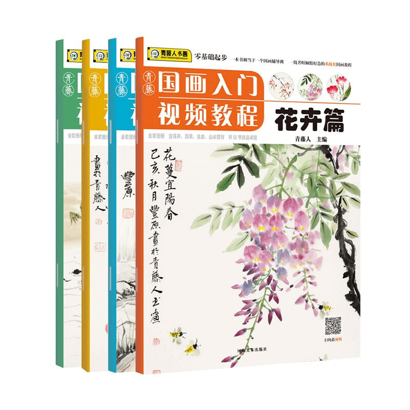 儿童中国画零基础临摹本少儿初学写意国画实用临摹教材传统水墨画课件 花卉山水鱼虫蔬果 河南美术 青藤国画入门视频教程 全套4册