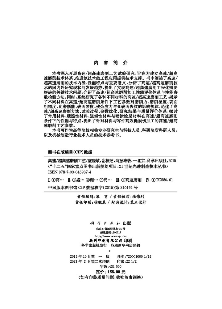 谢桂芝 盛晓敏 尚振涛 超高速磨削工艺 高速