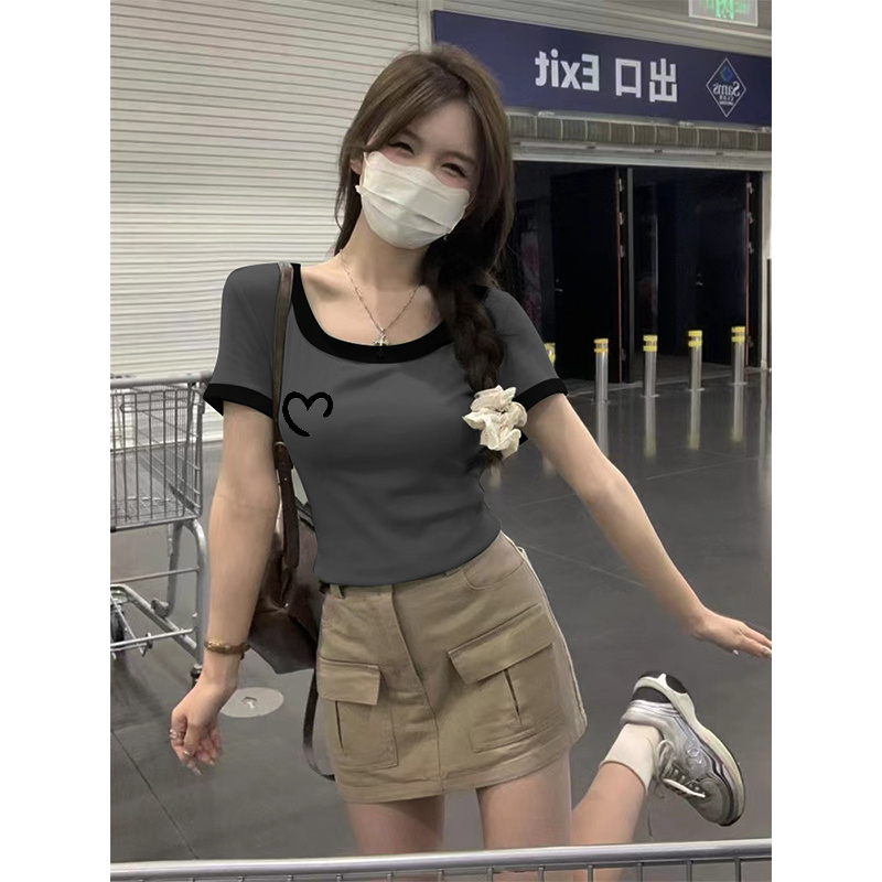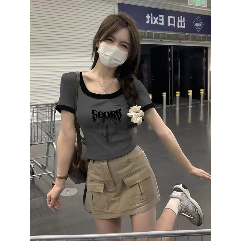 大码 正肩短袖 T恤女夏季 短款 胖mm显瘦设计感U领露锁骨上衣百搭 修身