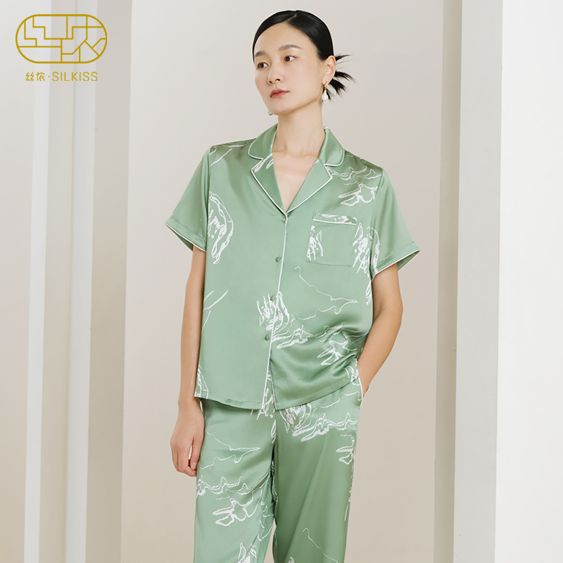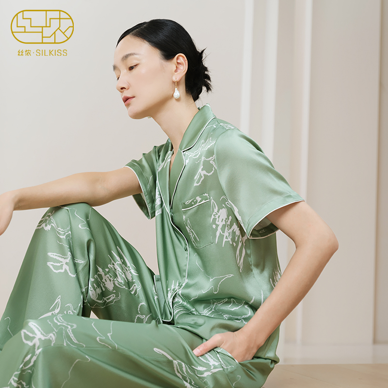 新款 100%桑蚕丝丝绸夏季 可外穿家居服 两件套装 真丝睡衣女春秋长袖