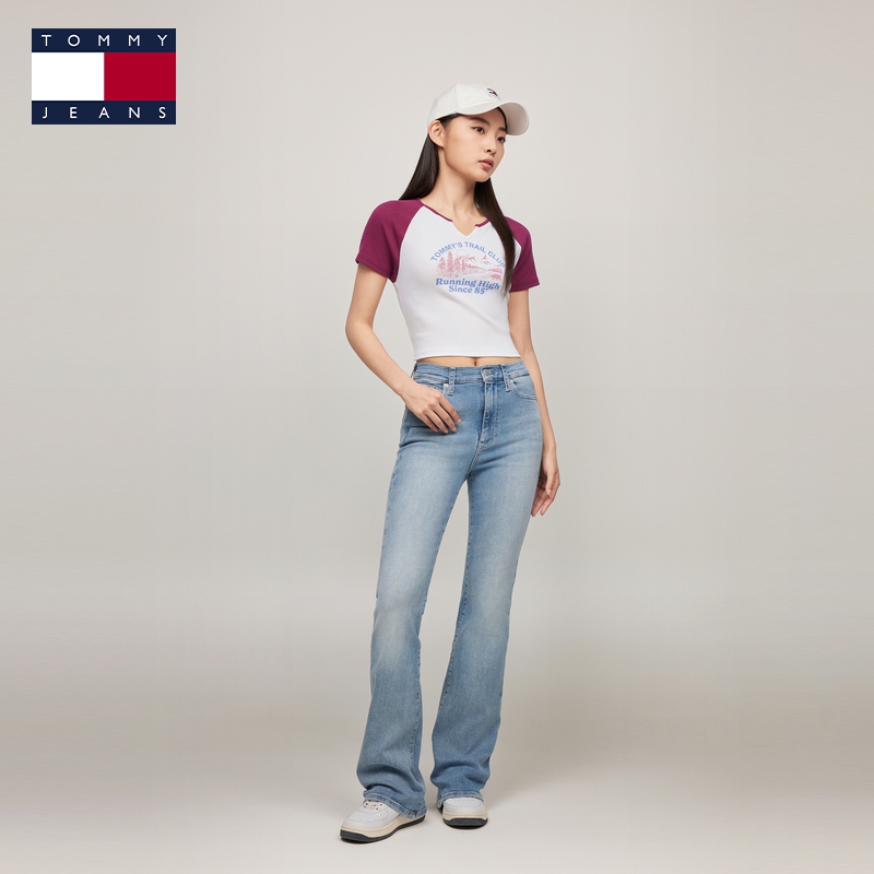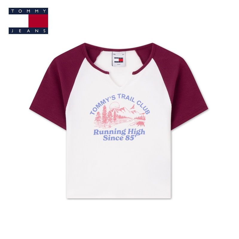 显瘦短袖 Tommy春夏女装 修身 潮流复古撞色小V领辣妹短款 T恤 美式