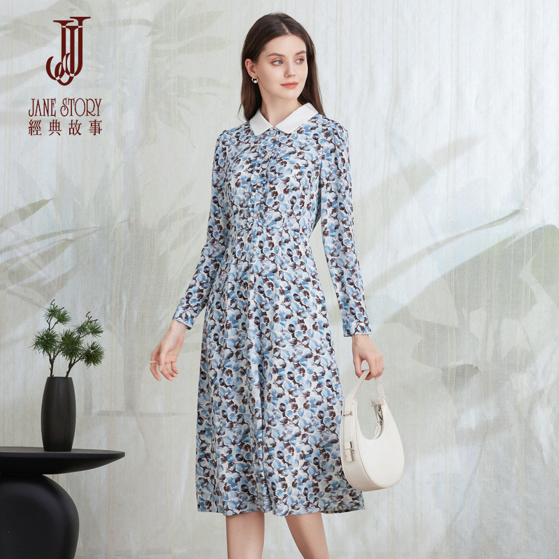 赫本风高腰V领中长款 百家好法式 连衣裙女小白裙子 House Basic