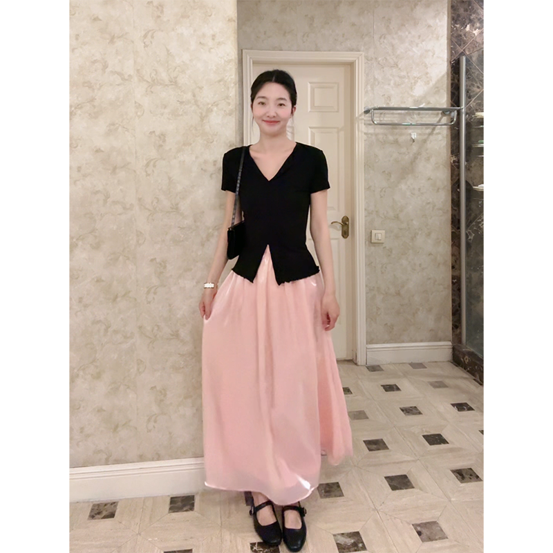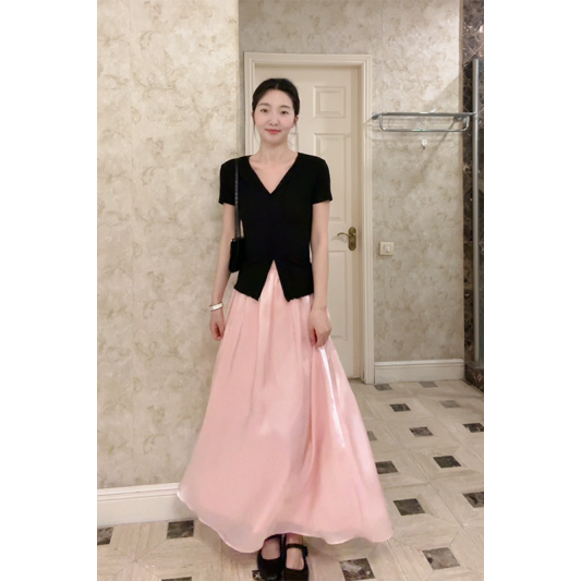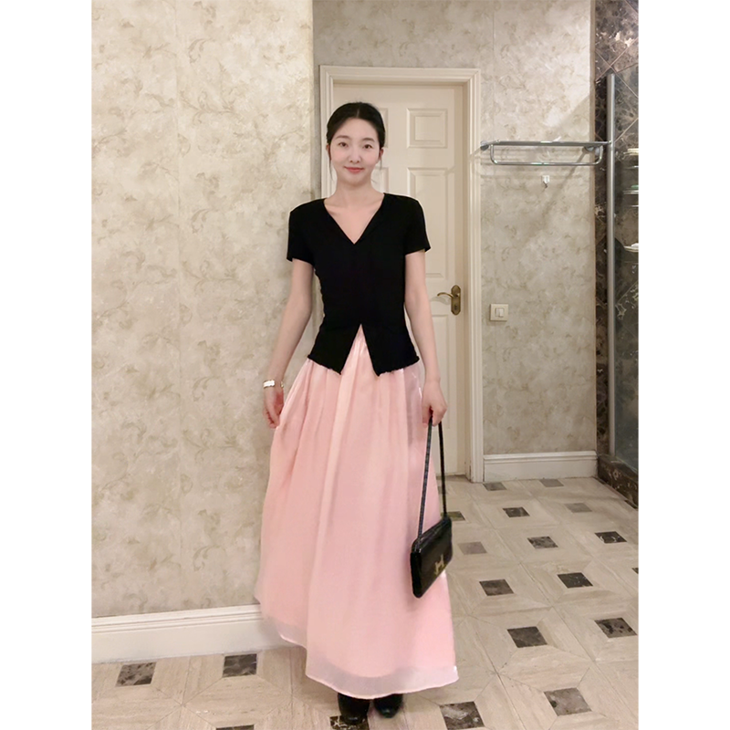 郭九九呢V领国风弹力显瘦木耳边上衣女夏季 百搭流光伞摆半身裙