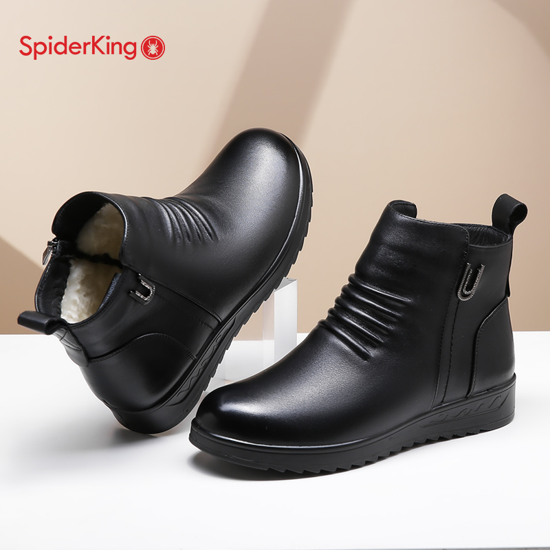 蜘蛛王妈妈棉靴厚底冬季 真皮靴子加绒加厚短靴保暖羊毛中老年棉鞋