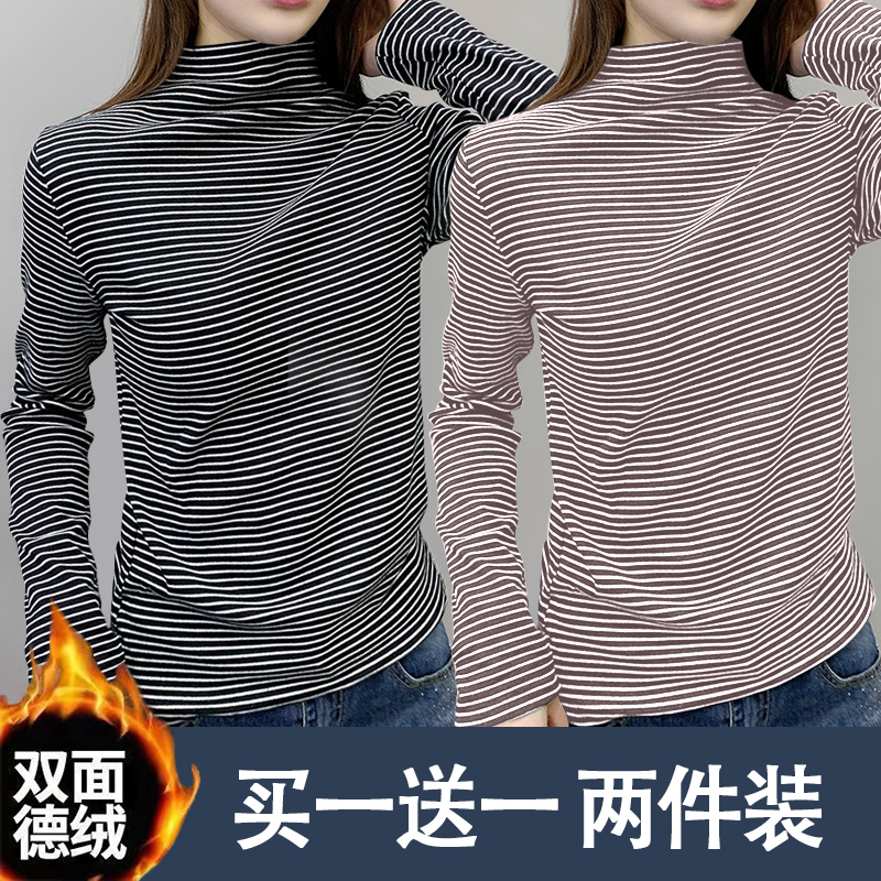 T恤保暖女衫 女秋冬长袖 上衣 2023年新款 条纹打底内搭半高领打底衫