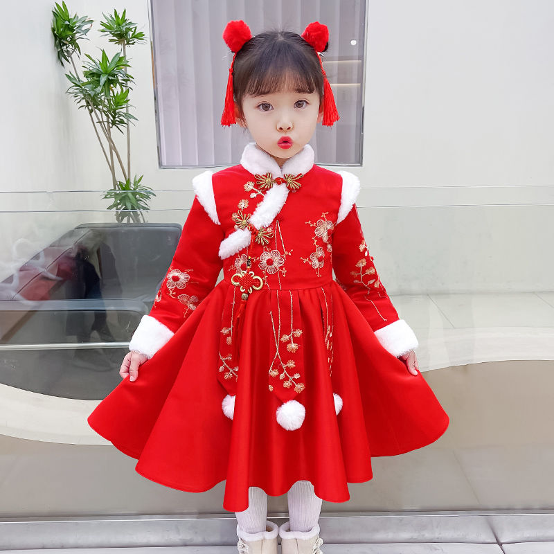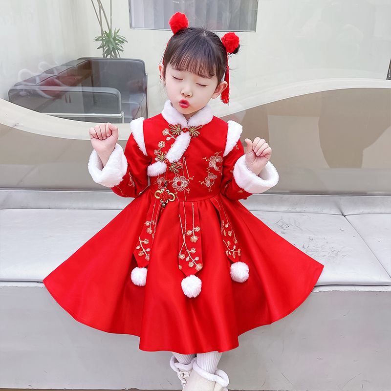 巴拉妮琪balaniqi汉服女童拜年服冬季 加绒旗袍裙红色喜庆新年衣服
