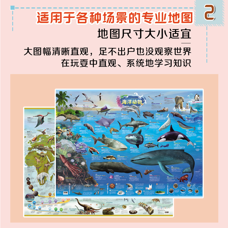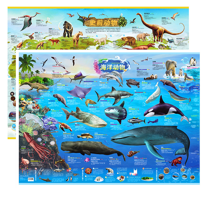 全2张史前动物地图海洋动物地图 挂墙贴儿童房专用超大挂图大尺寸高清远古恐龙书籍儿童科普百科全集启蒙海洋生物世界 正版