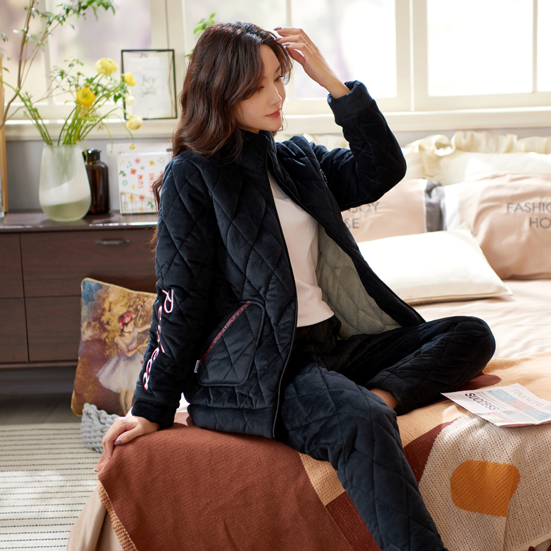 睡衣女秋冬季 加厚加绒珊瑚绒夹棉袄三层黑色运动可外穿家居服套装