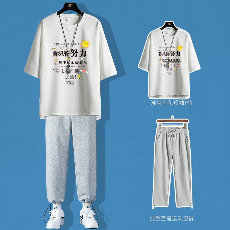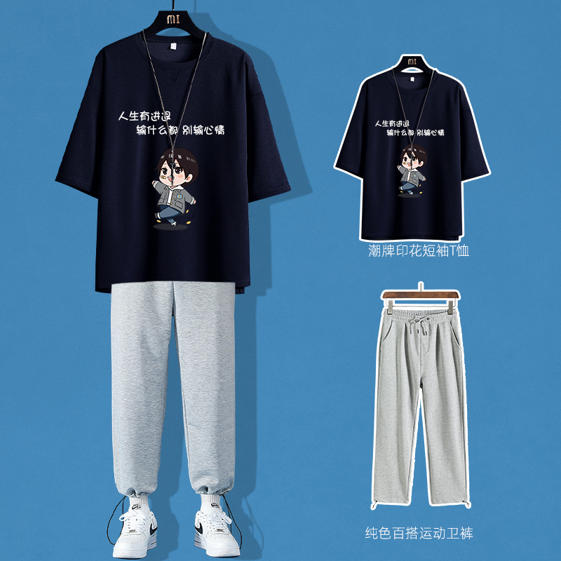 长裤 冰丝夏季 男学生宽松痞帅高街ins休闲套装 t恤新款 两件套 短袖