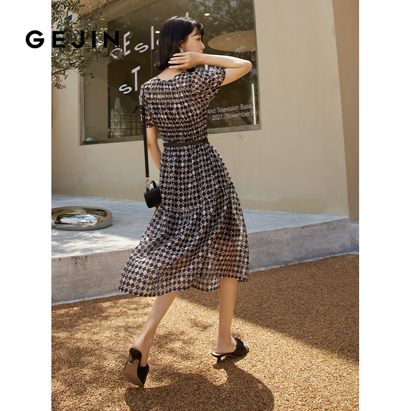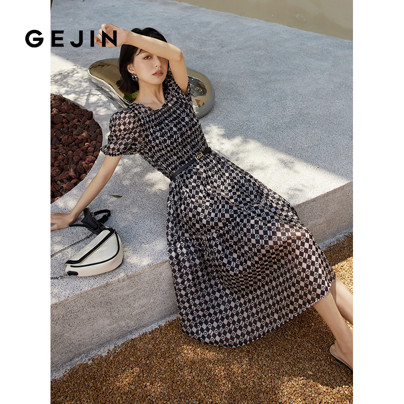 复古中长裙 黑白棋盘格收腰显瘦连衣裙女法式 歌锦2025年夏季 新款
