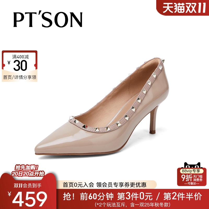 细高跟黑色鞋 女2025秋新款 子配裙子 百田森牛漆皮铆钉单鞋 商场同款