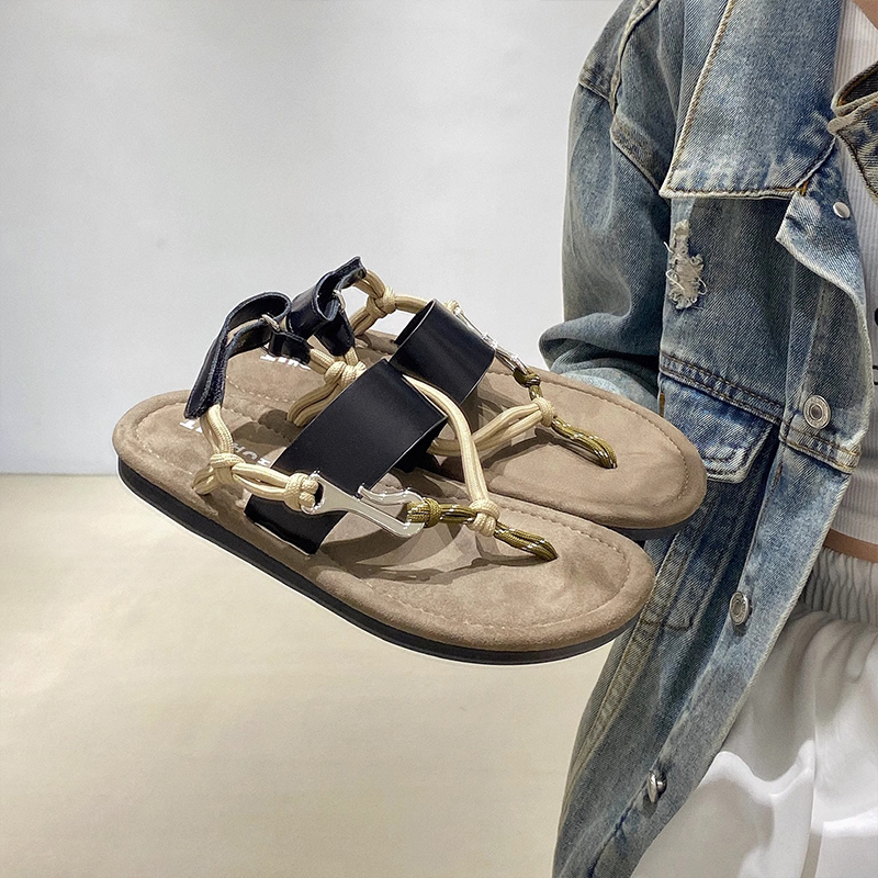 夏季 女 休闲露趾沙滩度假平底一字带夹趾黑色复古罗马人字夹脚凉鞋