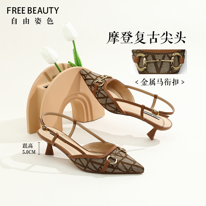 优雅包头凉鞋 自由姿色春夏新款 格纹马衔扣条带细跟复古风后空单鞋