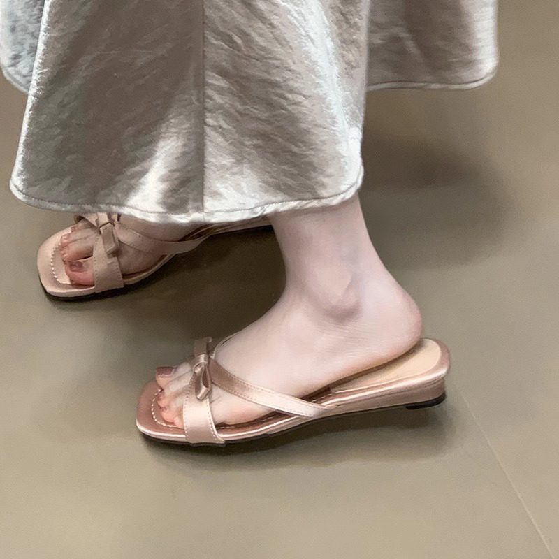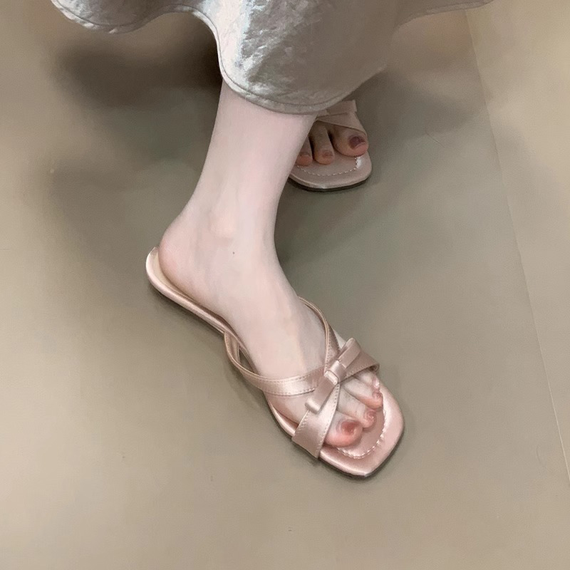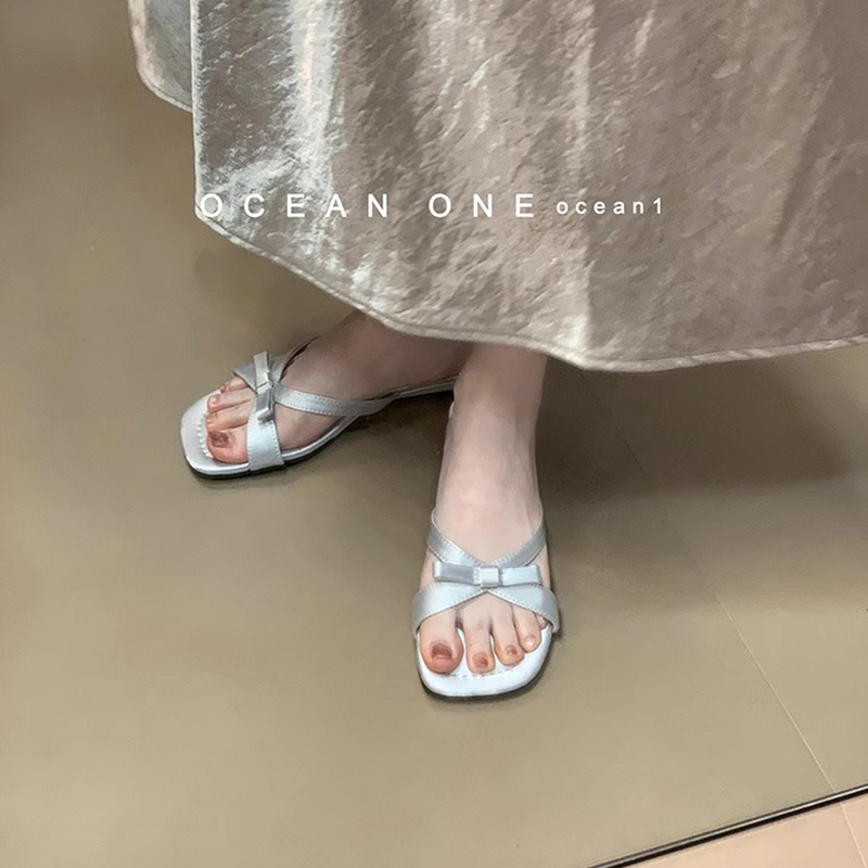 晚风配裙子一字拖鞋 女夏外穿2025新款 绝美绸缎蝴蝶结露趾凉鞋 法式