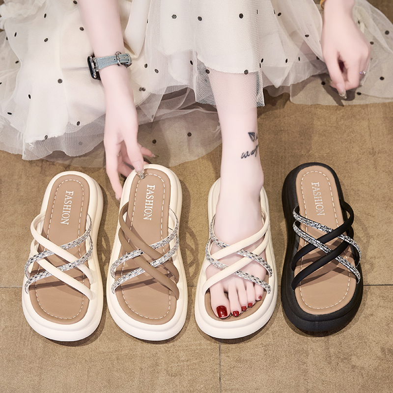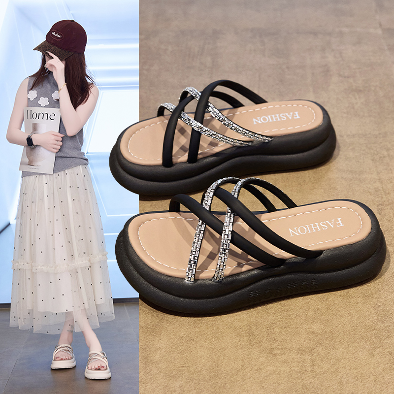 34码 外穿配裙子沙滩凉鞋 孕妇软底一字拖 女夏季 水钻软底厚底凉拖鞋