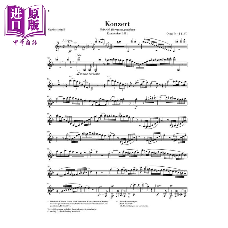 韦伯 HN732 Clar 降E大调第二单簧管协奏曲 进口艺术 flat 中商原版 op74 Concerto Weber 预售 major