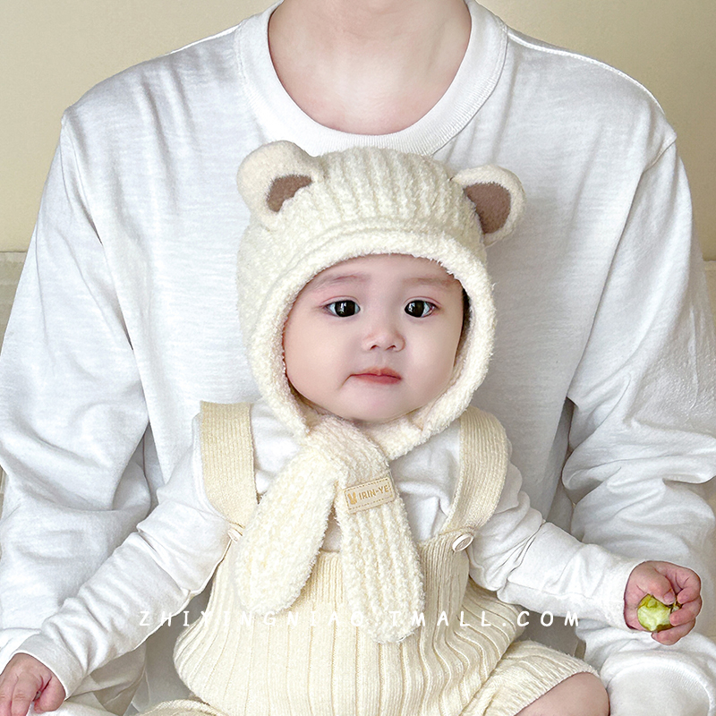 宝宝帽子秋冬季 针织帽婴儿护耳帽可爱超萌加厚保暖冬天围巾一体帽