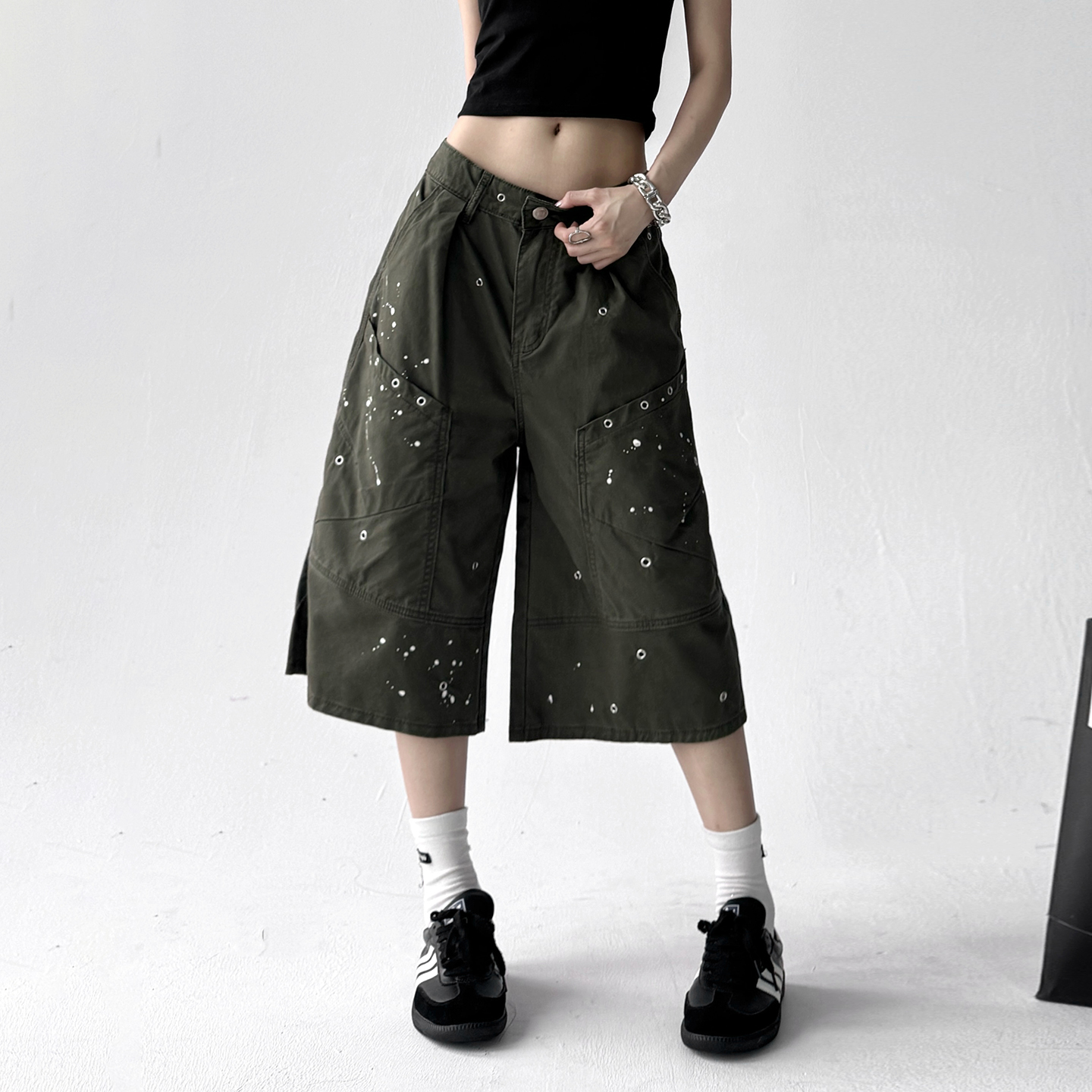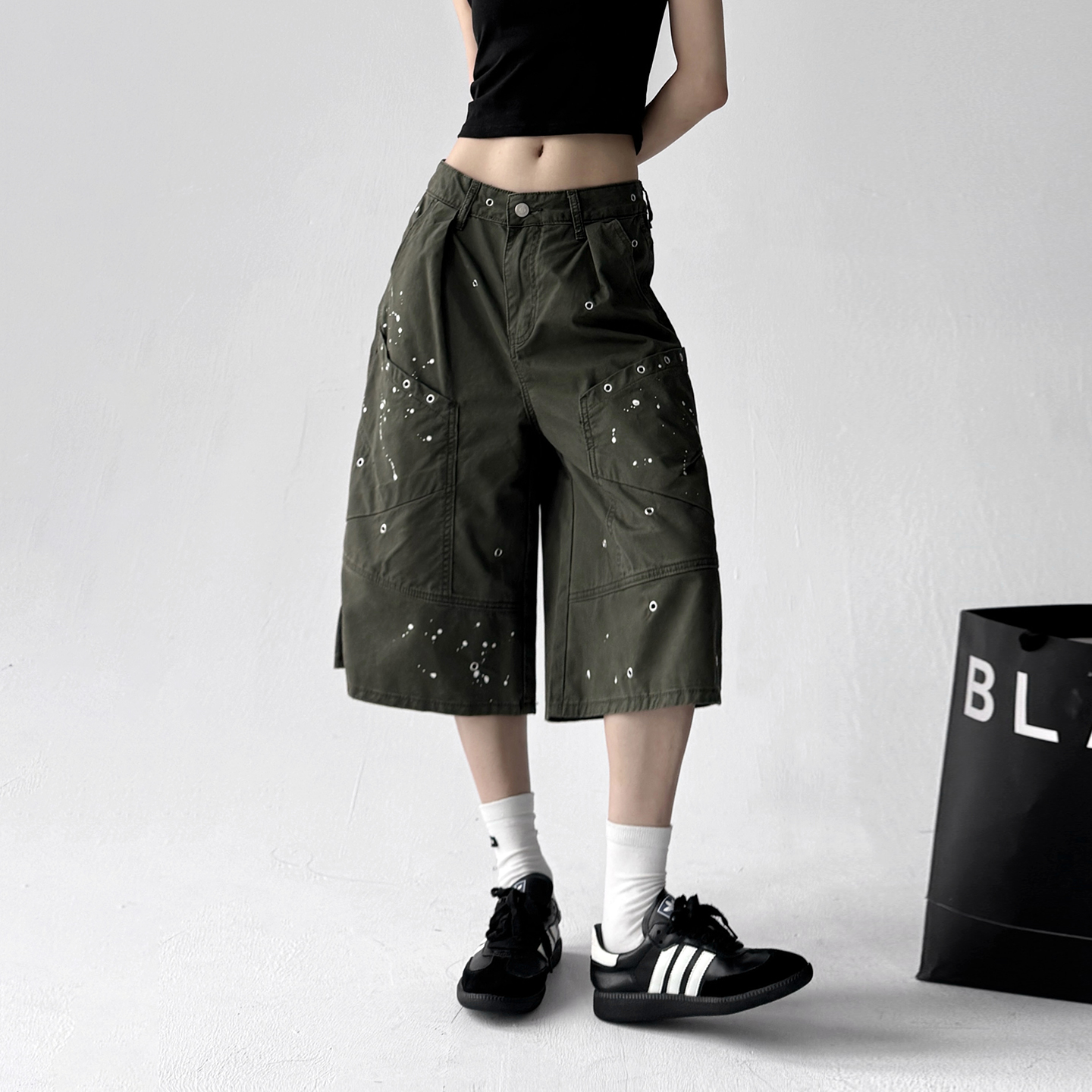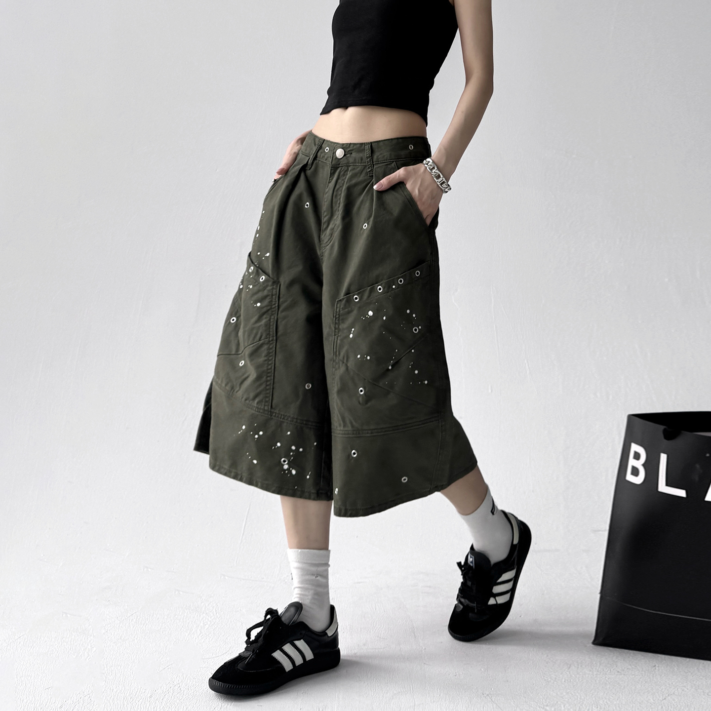 新款 女宽松高腰显瘦阔腿韩系休闲中裤 美式 裤 复古泼墨工装 2025夏季