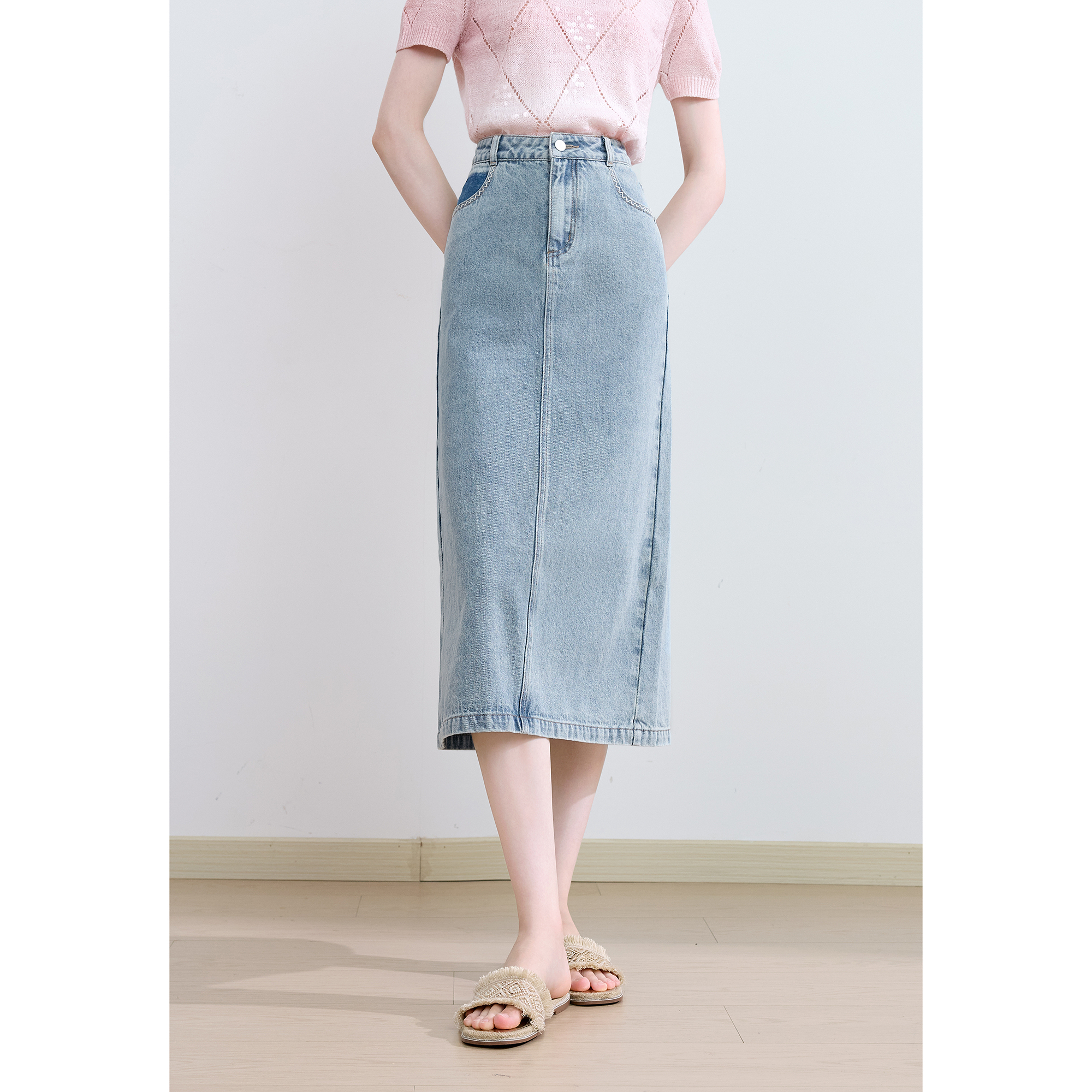 betu百图浅蓝色后开叉牛仔裙女半身裙2025年夏季 高腰中长裙 新款
